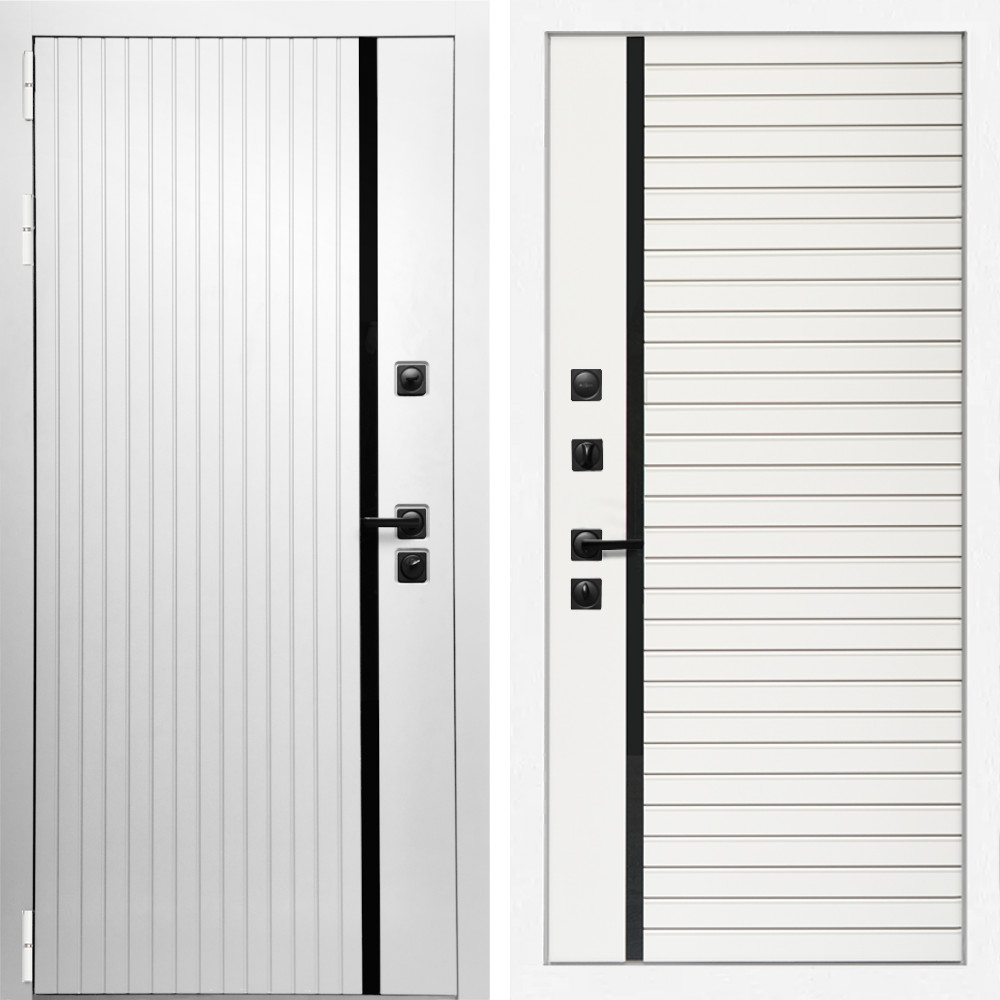 Входная дверь • Габаритные размеры: 2050x860 мм, 2050x960 мм • Металл 1.8мм • Внешнее покрытие: МДФ 16 мм белый мат с молдингом черная лакобель • Толщина полотна: 115 мм. • Толщина коробки: 120 мм. • Короб закрытого типа, утепленный • Уплотнитель: 3 контура • Два вертикальных ребра жесткости • Замок основной: Гардиан 6211 с блокировкой язычка • Замок дополнительный: Гардиан 6001 • Врезная броненакладка • Пазы на коробке под доборы • Независимая задвижка есть • Фурнитура Черная ..