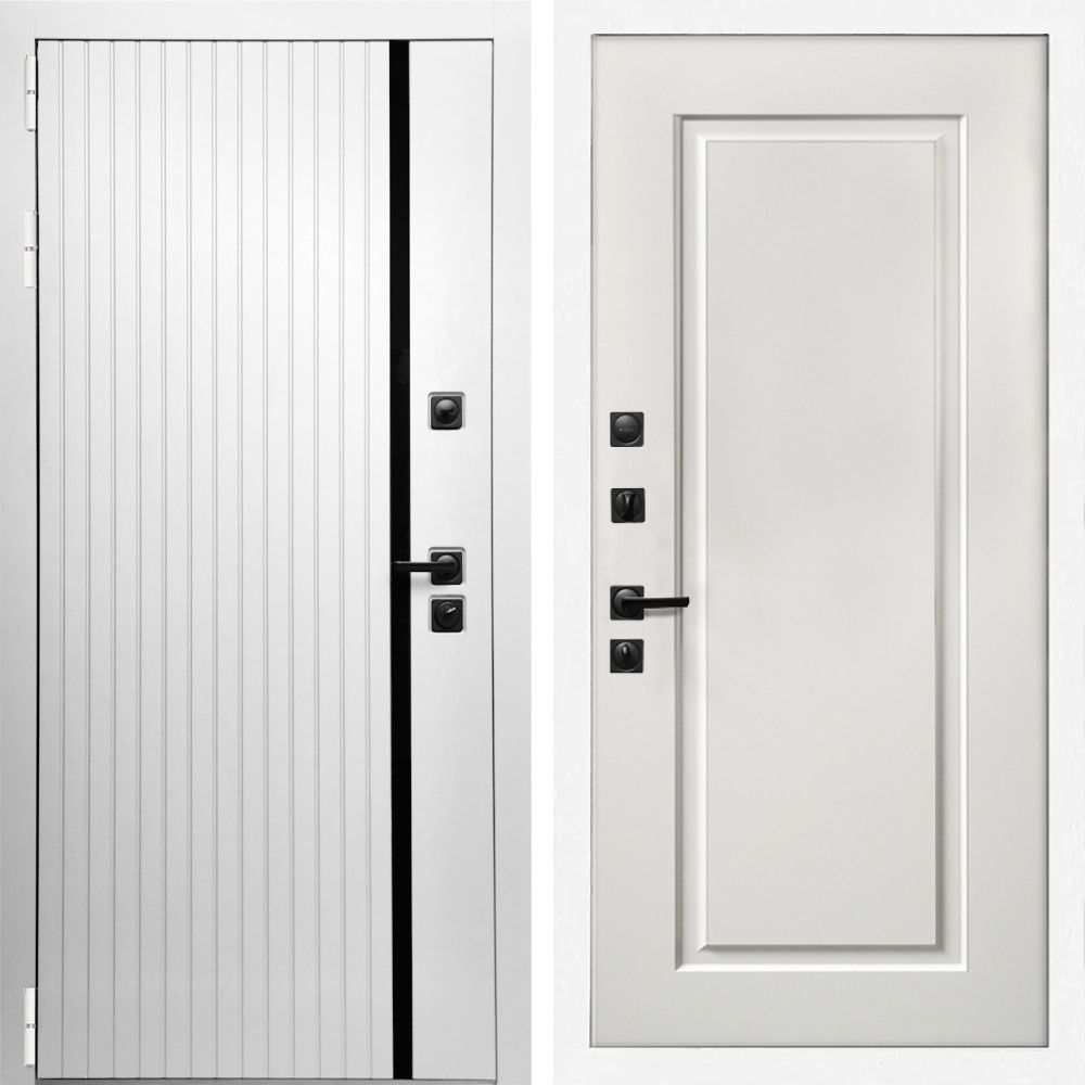 Входная дверь • Габаритные размеры: 2050x860 мм, 2050x960 мм • Металл 1.8мм • Внешнее покрытие: МДФ 16 мм белый мат с молдингом черная лакобель • Толщина полотна: 115 мм. • Толщина коробки: 120 мм. • Короб закрытого типа, утепленный • Уплотнитель: 3 контура • Два вертикальных ребра жесткости • Замок основной: Гардиан 6211 с блокировкой язычка • Замок дополнительный: Гардиан 6001 • Врезная броненакладка • Пазы на коробке под доборы • Независимая задвижка есть • Фурнитура Черная ..