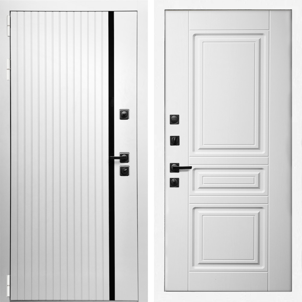 Входная дверь • Габаритные размеры: 2050x860 мм, 2050x960 мм • Металл 1.8мм • Внешнее покрытие: МДФ 16 мм белый мат с молдингом черная лакобель • Толщина полотна: 115 мм. • Толщина коробки: 120 мм. • Короб закрытого типа, утепленный • Уплотнитель: 3 контура • Два вертикальных ребра жесткости • Замок основной: Гардиан 6211 с блокировкой язычка • Замок дополнительный: Гардиан 6001 • Врезная броненакладка • Пазы на коробке под доборы • Независимая задвижка есть • Фурнитура Черная ..
