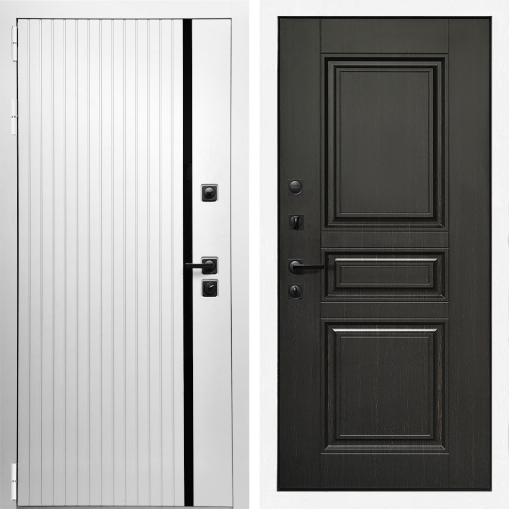 Входная дверь • Габаритные размеры: 2050x860 мм, 2050x960 мм • Металл 1.8мм • Внешнее покрытие: МДФ 16 мм. • Толщина полотна: 115 мм. • Толщина коробки: 120 мм. • Короб закрытого типа, утепленный • Уплотнитель: 3 контура • Два вертикальных ребра жесткости • Замок основной: Гардиан 6211 с блокировкой язычка • Замок дополнительный: Гардиан 6001 • Врезная броненакладка • Пазы на коробке под доборы • Независимая задвижка есть • Фурнитура ХРОМ