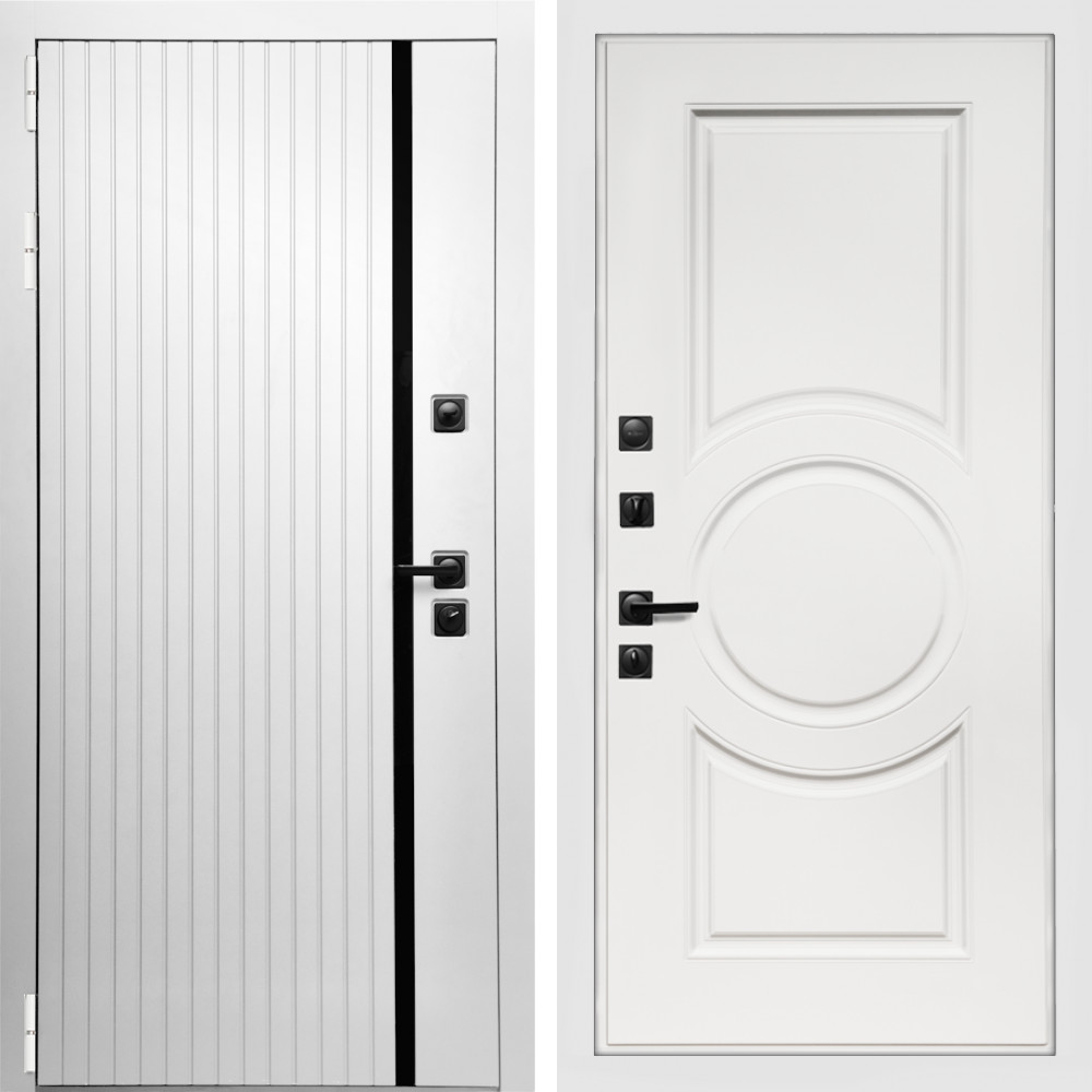 Входная дверь • Габаритные размеры: 2050x860 мм, 2050x960 мм • Металл 1.8мм • Внешнее покрытие: МДФ 16 мм белый мат с молдингом черная лакобель • Толщина полотна: 115 мм. • Толщина коробки: 120 мм. • Короб закрытого типа, утепленный • Уплотнитель: 3 контура • Два вертикальных ребра жесткости • Замок основной: Гардиан 6211 с блокировкой язычка • Замок дополнительный: Гардиан 6001 • Врезная броненакладка • Пазы на коробке под доборы • Независимая задвижка есть • Фурнитура Черная ..