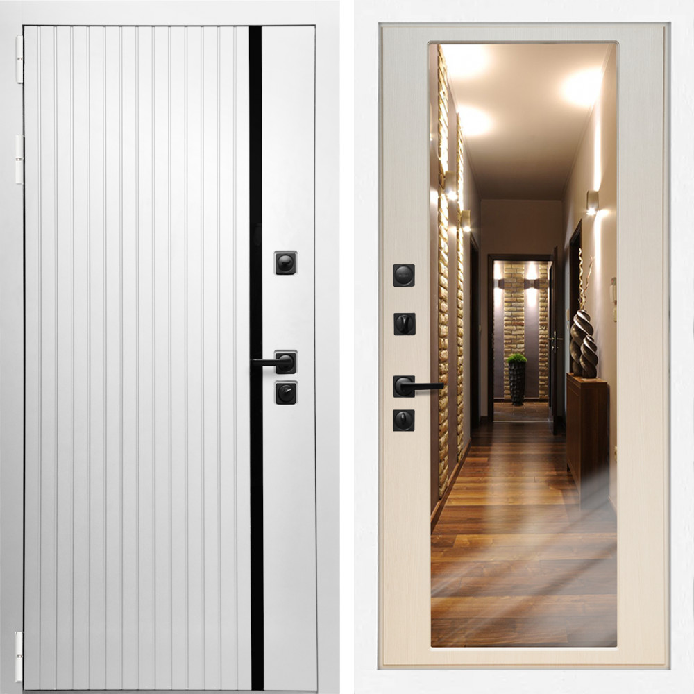 Входная дверь • Габаритные размеры: 2050x860 мм, 2050x960 мм • Металл 1.8мм • Внешнее покрытие: МДФ 16 мм белый мат с молдингом черная лакобель • Толщина полотна: 115 мм. • Толщина коробки: 120 мм. • Короб закрытого типа, утепленный • Уплотнитель: 3 контура • Два вертикальных ребра жесткости • Замок основной: Гардиан 6211 с блокировкой язычка • Замок дополнительный: Гардиан 6001 • Врезная броненакладка • Пазы на коробке под доборы • Независимая задвижка есть • Фурнитура Черная ..