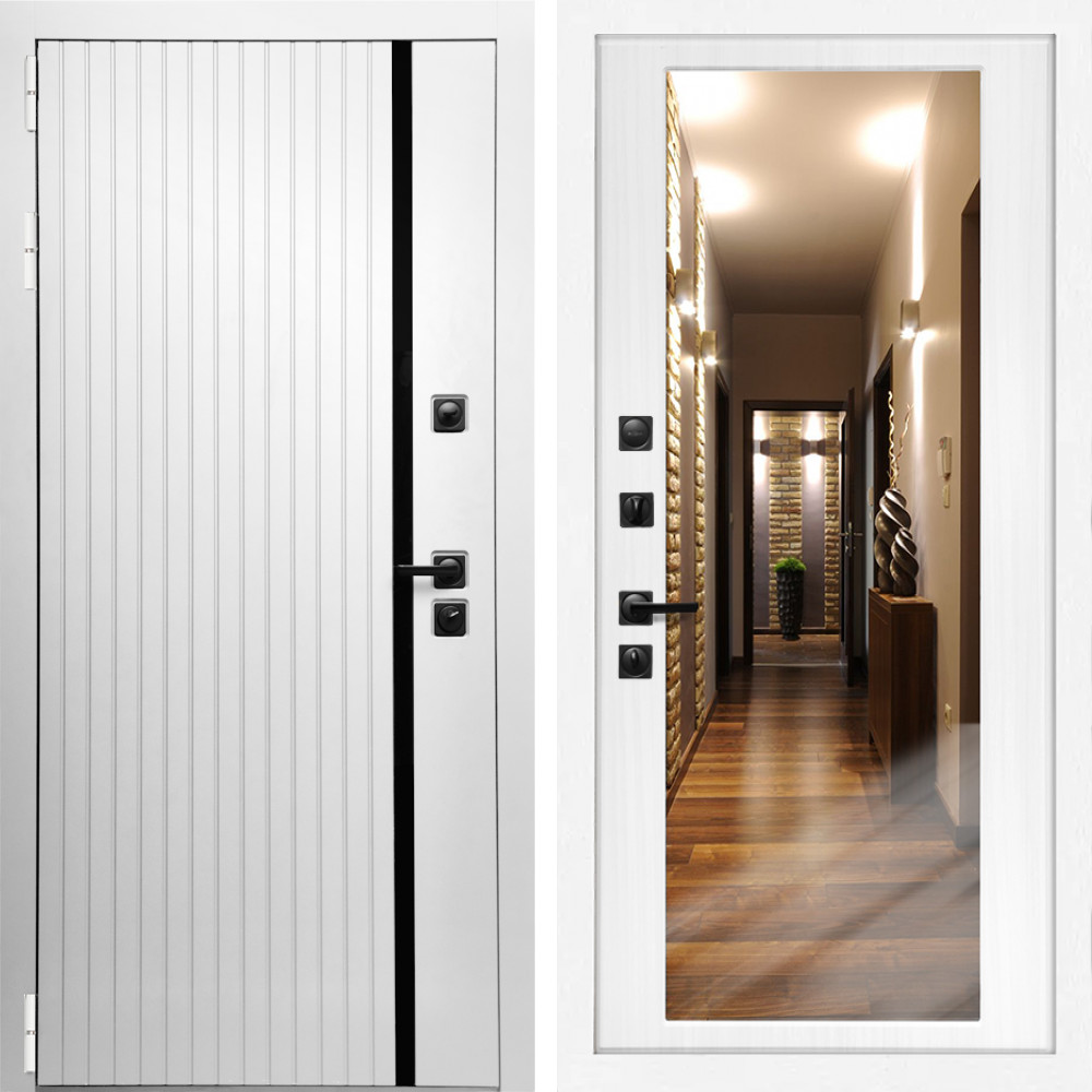 Входная дверь • Габаритные размеры: 2050x860 мм, 2050x960 мм • Металл 1.8мм • Внешнее покрытие: МДФ 16 мм белый мат с молдингом черная лакобель • Толщина полотна: 115 мм. • Толщина коробки: 120 мм. • Короб закрытого типа, утепленный • Уплотнитель: 3 контура • Два вертикальных ребра жесткости • Замок основной: Гардиан 6211 с блокировкой язычка • Замок дополнительный: Гардиан 6001 • Врезная броненакладка • Пазы на коробке под доборы • Независимая задвижка есть • Фурнитура Черная ..