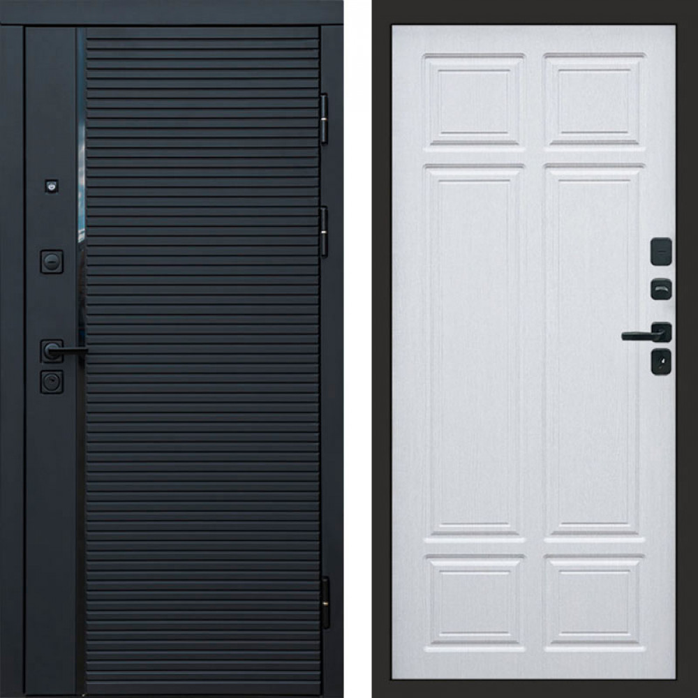 Входная дверь • Габаритные размеры: 2050x860 мм, 2050x960 мм • Металл 1.8мм • Внешнее покрытие: МДФ 16 мм белый мат с молдингом черная лакобель • Толщина полотна: 115 мм. • Толщина коробки: 120 мм. • Короб закрытого типа, утепленный • Уплотнитель: 3 контура • Два вертикальных ребра жесткости • Замок основной: Гардиан 6211 с блокировкой язычка • Замок дополнительный: Гардиан 6001 • Врезная броненакладка • Пазы на коробке под доборы • Независимая задвижка есть • Фурнитура Черная