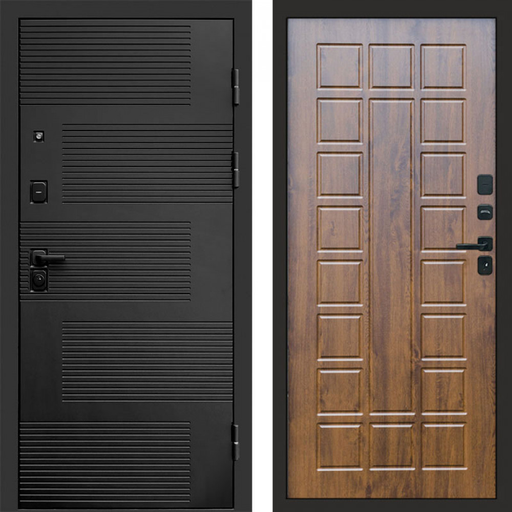 Входная дверь • Габаритные размеры: 2050x860 мм, 2050x960 мм • Металл 1.8мм. Черная шагрень • Внешнее покрытие: МДФ 12 мм. • Толщина полотна: 115 мм. • Толщина коробки: 120 мм. • Короб закрытого типа, утепленный • Уплотнитель: 3 контура • Два вертикальных ребра жесткости • ЭЛЕКТРОННЫЙ ЗАМОК НА ВЫБОР • Замок дополнительный: Гардиан 6001 • Врезная броненакладка • Пазы на коробке под доборы • Независимая задвижка есть • Фурнитура ЧЕРНАЯ