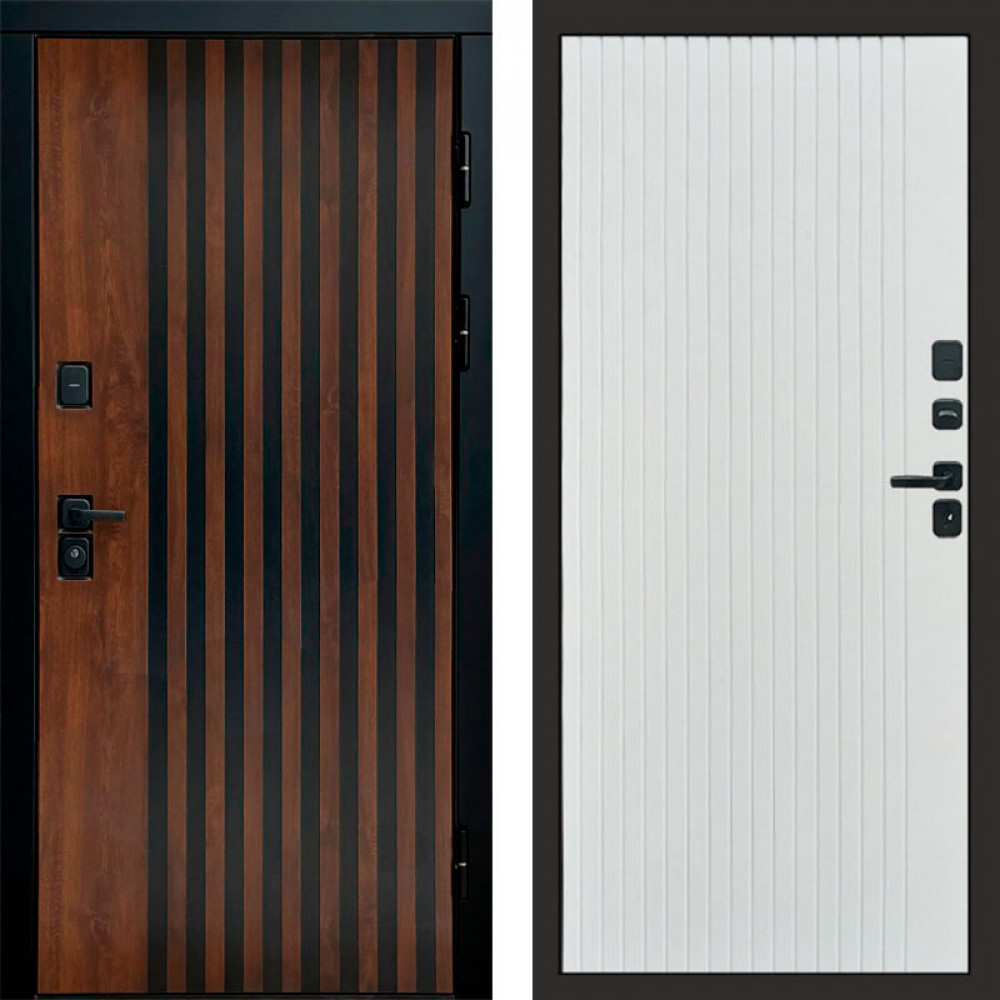 Входная дверь • Габаритные размеры: 2050x860 мм, 2050x960 мм • Металл 1.8мм • Внешнее покрытие: МДФ 16 мм. • Толщина полотна: 115 мм. • Толщина коробки: 120 мм. • Короб закрытого типа, утепленный • Уплотнитель: 3 контура • Два вертикальных ребра жесткости • Замок основной: Гардиан 6211 с блокировкой язычка • Замок дополнительный: Гардиан 6001 • Врезная броненакладка • Пазы на коробке под доборы • Независимая задвижка есть • Фурнитура Хром