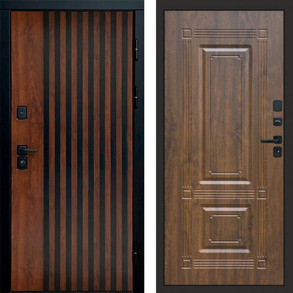Входная дверь • Габаритные размеры: 2050x860 мм, 2050x960 мм • Металл 1.8мм • Внешнее покрытие: МДФ 16 мм. • Толщина полотна: 115 мм. • Толщина коробки: 120 мм. • Короб закрытого типа, утепленный • Уплотнитель: 3 контура • Два вертикальных ребра жесткости • Замок основной: Гардиан 6211 с блокировкой язычка • Замок дополнительный: Гардиан 6001 • Врезная броненакладка • Пазы на коробке под доборы • Независимая задвижка есть • Фурнитура ХРОМ