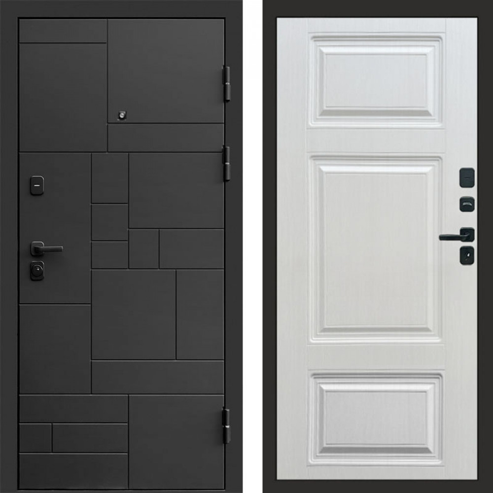 Входная дверь • Габаритные размеры: 2050x860 мм, 2050x960 мм • Металл 1.8мм • Внешнее покрытие: МДФ 16 мм. • Толщина полотна: 115 мм. • Толщина коробки: 120 мм. • Короб закрытого типа, утепленный • Уплотнитель: 3 контура • Два вертикальных ребра жесткости • Замок основной: Гардиан 6211 с блокировкой язычка • Замок дополнительный: Гардиан 6001 • Врезная броненакладка • Пазы на коробке под доборы • Независимая задвижка есть • Фурнитура Черная