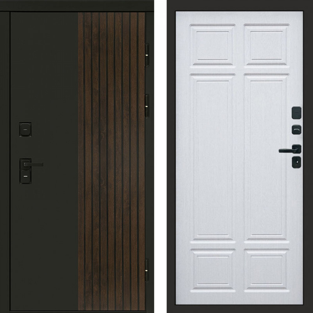 Входная дверь • Габаритные размеры: 2050x860 мм, 2050x960 мм • Металл 1.5мм. • Внешнее покрытие: МДФ 12 мм. • Цвет покрытия: Графит. • Толщина полотна: 100 мм. • Толщина коробки: 105 мм. • Окрас короба:Черная шагрень. • Короб закрытого типа, утепленный. • Уплотнитель: 3 контура. • Два вертикальных ребра жесткости. • Замок основной: Guardian 3211 (цилиндровый). • Замок дополнительный: Guardian 300 • Врезная броненакладка. • Независимая задвижка есть. • Фурнитура Черная.
