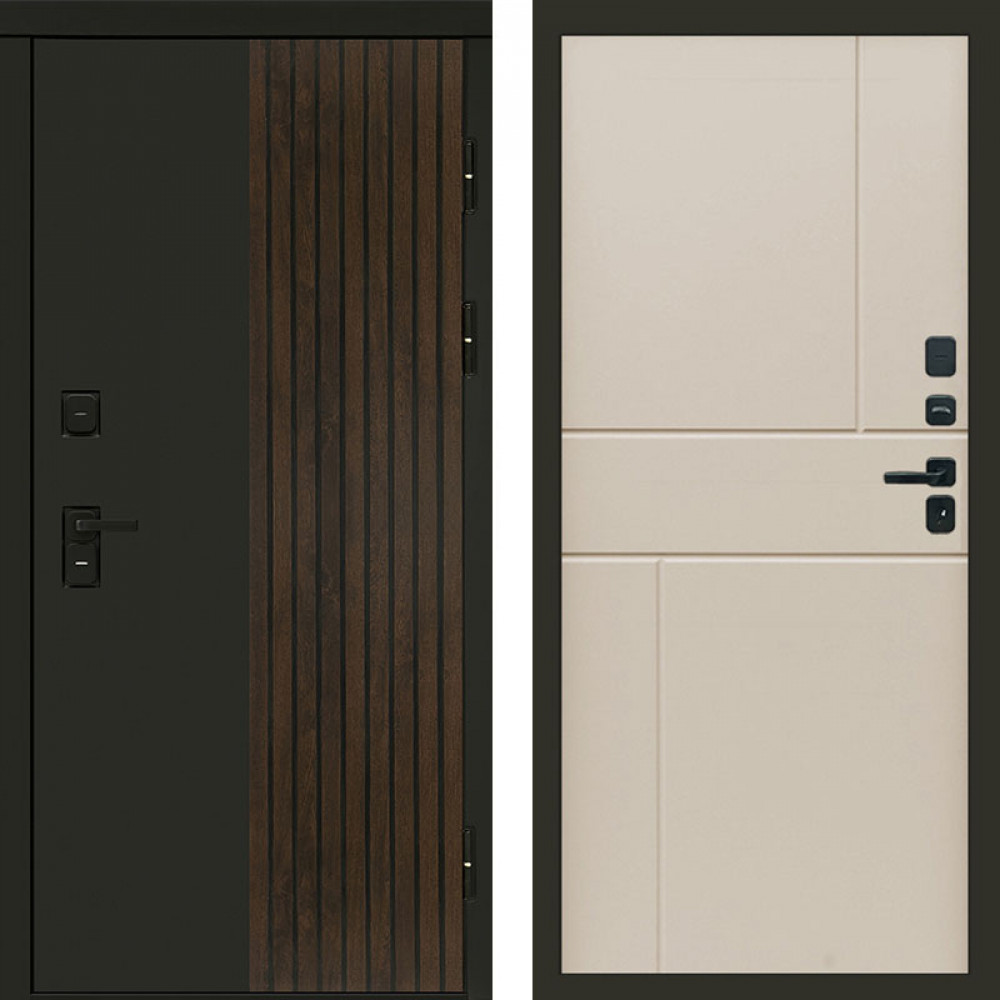 Входная дверь • Габаритные размеры: 2050x860 мм, 2050x960 мм • Металл 1.8мм. Черная шагрень • Внешнее покрытие: МДФ 12 мм. • Толщина полотна: 115 мм. • Толщина коробки: 120 мм. • Короб закрытого типа, утепленный • Уплотнитель: 3 контура • Два вертикальных ребра жесткости • ЭЛЕКТРОННЫЙ ЗАМОК НА ВЫБОР • Замок дополнительный: Гардиан 6001 • Врезная броненакладка • Пазы на коробке под доборы • Независимая задвижка есть • Фурнитура ЧЕРНАЯ