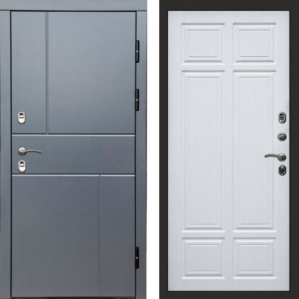Входная дверь • Габаритные размеры: 2050x860 мм, 2050x960 мм • Металл 1.8мм • Внешнее покрытие: МДФ 16 мм белый мат с молдингом черная лакобель • Толщина полотна: 115 мм. • Толщина коробки: 120 мм. • Короб закрытого типа, утепленный • Уплотнитель: 3 контура • Два вертикальных ребра жесткости • Замок основной: Гардиан 6211 с блокировкой язычка • Замок дополнительный: Гардиан 6001 • Врезная броненакладка • Пазы на коробке под доборы • Независимая задвижка есть • Фурнитура Черная