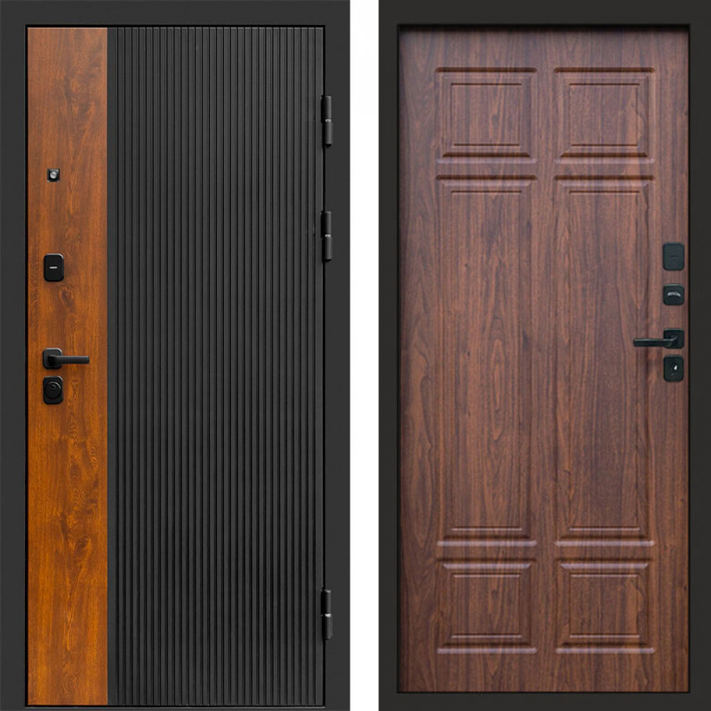 Входная дверь • Габаритные размеры: 2050x860 мм, 2050x960 мм • Металл 1.5мм. • Внешнее покрытие: МДФ 12 мм. • Цвет покрытия: Орех коньяк кантри/Черный кварц. • Толщина полотна: 100 мм. • Толщина коробки: 105 мм. • Окрас короба:Черная шагрень. • Короб закрытого типа, утепленный. • Уплотнитель: 3 контура. • Два вертикальных ребра жесткости. • Замок основной: Guardian 3211 (цилиндровый). • Замок дополнительный: Guardian 300 • Врезная броненакладка. • Независимая задвижка есть. • Фурнитура Черная.
