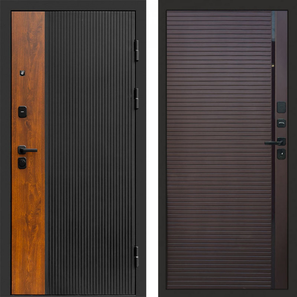 Входная дверь • Габаритные размеры: 2050x860 мм, 2050x960 мм • Металл 1.8мм. Черная шагрень • Внешнее покрытие: МДФ 12 мм. • Толщина полотна: 115 мм. • Толщина коробки: 120 мм. • Короб закрытого типа, утепленный • Уплотнитель: 3 контура • Два вертикальных ребра жесткости • ЭЛЕКТРОННЫЙ ЗАМОК НА ВЫБОР • Замок дополнительный: Гардиан 6001 • Врезная броненакладка • Пазы на коробке под доборы • Независимая задвижка есть • Фурнитура ЧЕРНАЯ