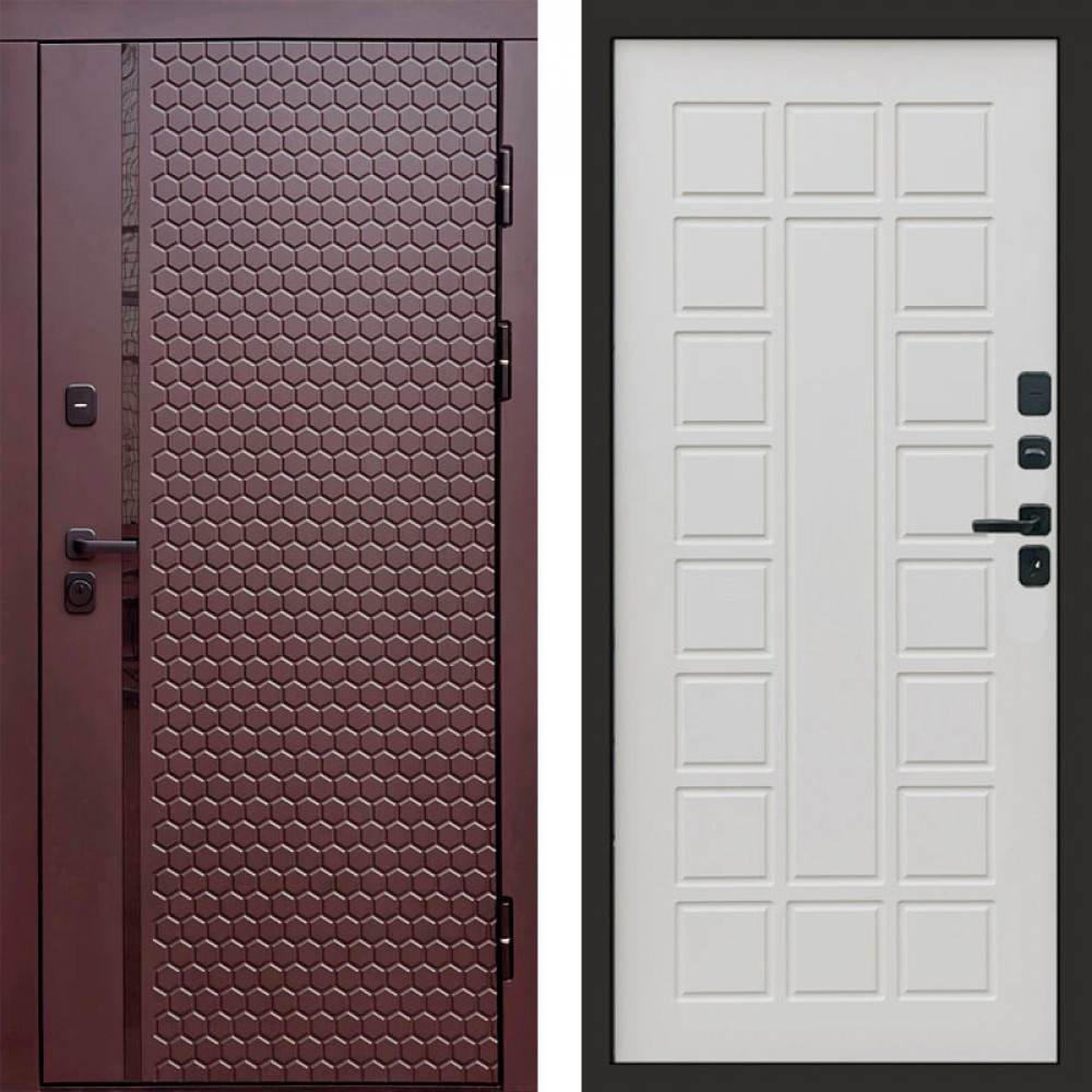 Входная дверь • Габаритные размеры: 2050x860 мм, 2050x960 мм • Металл 1.8мм • Внешнее покрытие: МДФ 16 мм. • Толщина полотна: 115 мм. • Толщина коробки: 120 мм. • Короб закрытого типа, утепленный • Уплотнитель: 3 контура • Два вертикальных ребра жесткости • Замок основной: Гардиан 6211 с блокировкой язычка • Замок дополнительный: Гардиан 6001 • Врезная броненакладка • Пазы на коробке под доборы • Независимая задвижка есть • Фурнитура Хром