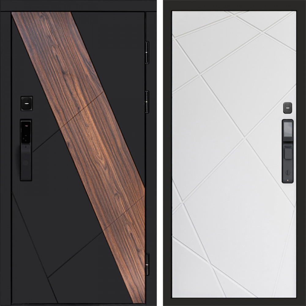 Входная дверь • Габаритные размеры: 2050x860 мм, 2050x960 мм • Металл 1.8мм • Внешнее покрытие: МДФ 16 мм. • Толщина полотна: 115 мм. • Толщина коробки: 120 мм. • Короб закрытого типа, утепленный • Уплотнитель: 3 контура • Два вертикальных ребра жесткости • Замок основной: Гардиан 6211 с блокировкой язычка • Замок дополнительный: Гардиан 6001 • Врезная броненакладка • Пазы на коробке под доборы • Независимая задвижка есть • Фурнитура Черная