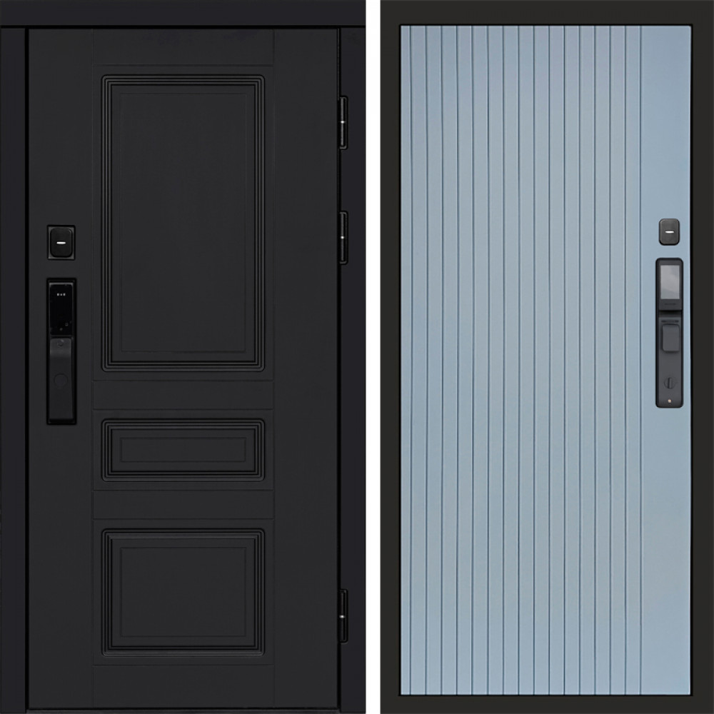 Входная дверь • Габаритные размеры: 2050x860 мм, 2050x960 мм • Металл 1.8мм. Черная шагрень • Внешнее покрытие: МДФ 12 мм. • Толщина полотна: 115 мм. • Толщина коробки: 120 мм. • Короб закрытого типа, утепленный • Уплотнитель: 3 контура • Два вертикальных ребра жесткости • ЭЛЕКТРОННЫЙ ЗАМОК НА ВЫБОР • Замок дополнительный: Гардиан 6001 • Врезная броненакладка • Пазы на коробке под доборы • Независимая задвижка есть • Фурнитура ЧЕРНАЯ