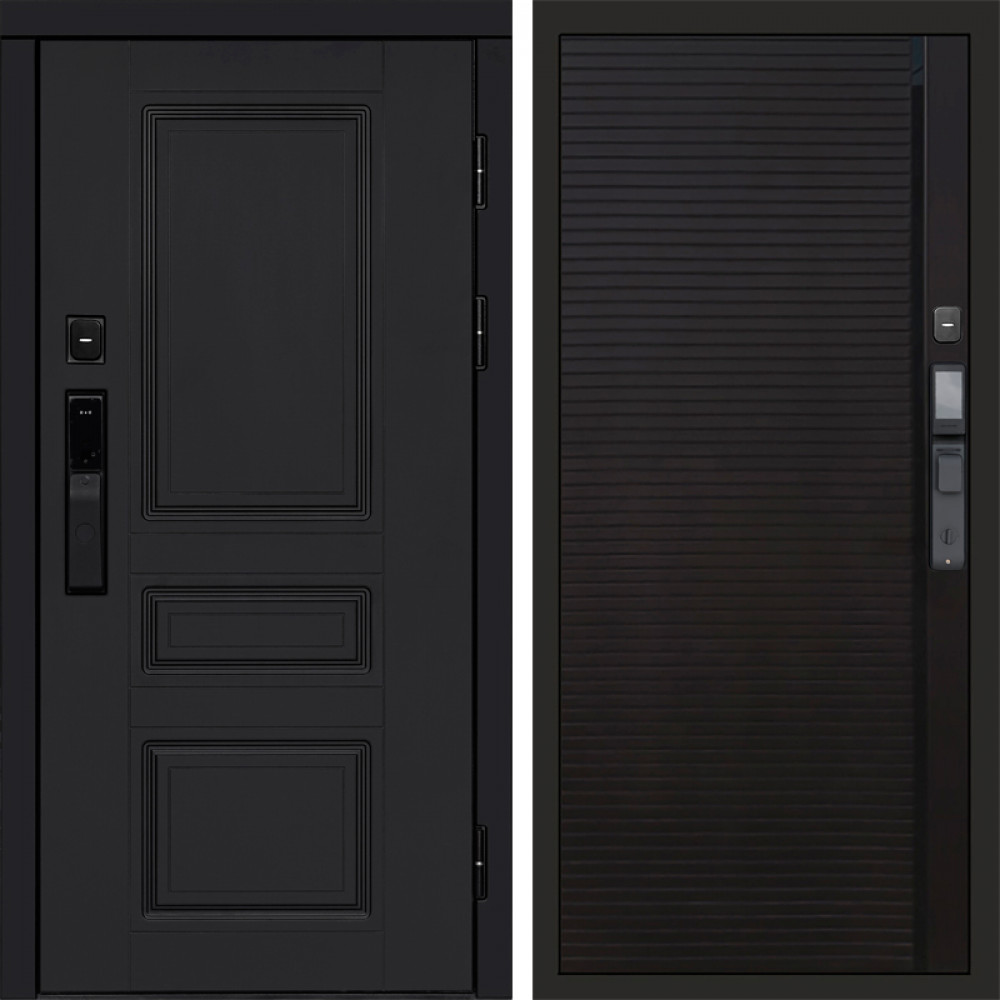 Входная дверь • Габаритные размеры: 2050x860 мм, 2050x960 мм • Металл 1.8мм. Черная шагрень • Внешнее покрытие: МДФ 12 мм. • Толщина полотна: 115 мм. • Толщина коробки: 120 мм. • Короб закрытого типа, утепленный • Уплотнитель: 3 контура • Два вертикальных ребра жесткости • ЭЛЕКТРОННЫЙ ЗАМОК НА ВЫБОР • Замок дополнительный: Гардиан 6001 • Врезная броненакладка • Пазы на коробке под доборы • Независимая задвижка есть • Фурнитура ЧЕРНАЯ