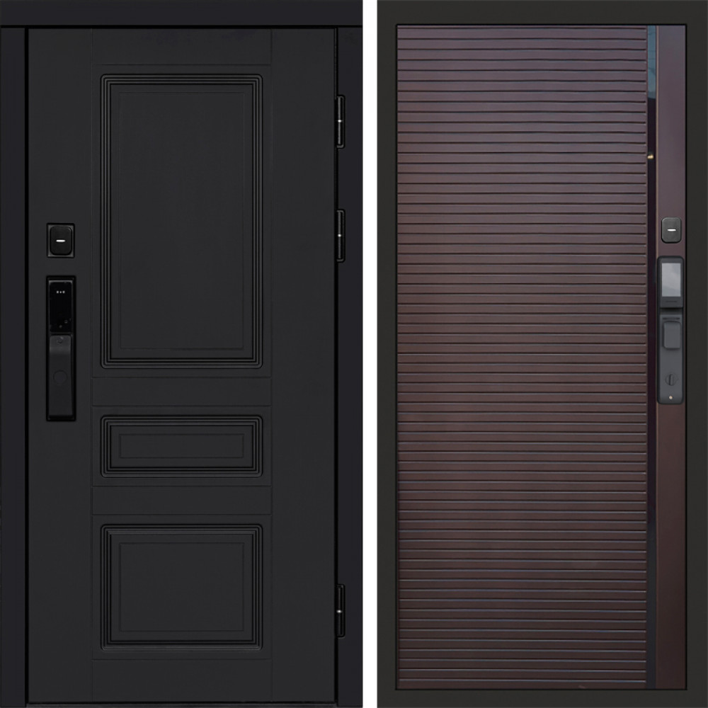 Входная дверь • Габаритные размеры: 2050x860 мм, 2050x960 мм • Металл 1.8мм. Черная шагрень • Внешнее покрытие: МДФ 12 мм. • Толщина полотна: 115 мм. • Толщина коробки: 120 мм. • Короб закрытого типа, утепленный • Уплотнитель: 3 контура • Два вертикальных ребра жесткости • ЭЛЕКТРОННЫЙ ЗАМОК НА ВЫБОР • Замок дополнительный: Гардиан 6001 • Врезная броненакладка • Пазы на коробке под доборы • Независимая задвижка есть • Фурнитура ЧЕРНАЯ