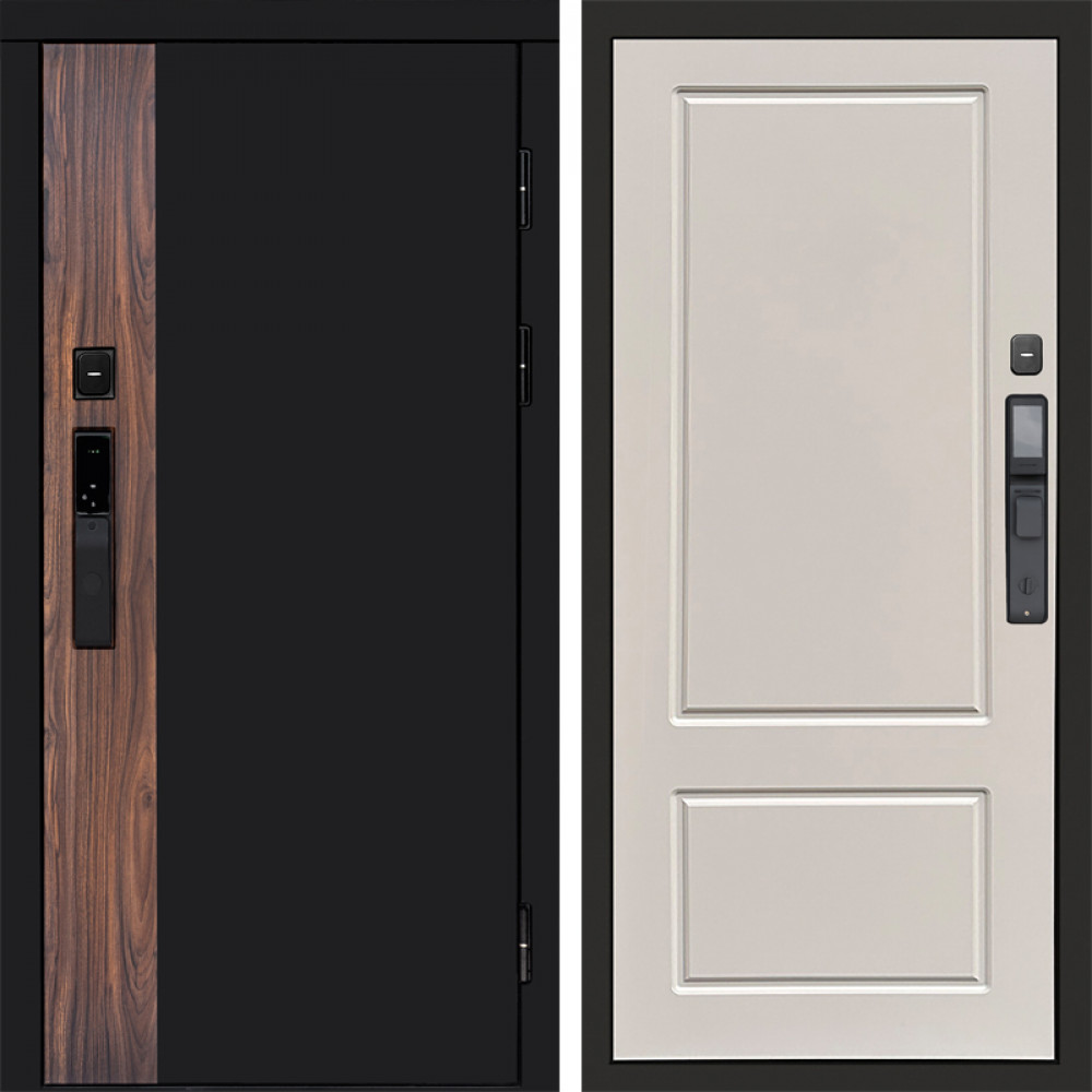 Входная дверь • Габаритные размеры: 2050x860 мм, 2050x960 мм • Металл 1.8мм. Черная шагрень • Внешнее покрытие: МДФ 12 мм. • Толщина полотна: 115 мм. • Толщина коробки: 120 мм. • Короб закрытого типа, утепленный • Уплотнитель: 3 контура • Два вертикальных ребра жесткости • ЭЛЕКТРОННЫЙ ЗАМОК НА ВЫБОР • Замок дополнительный: Гардиан 6001 • Врезная броненакладка • Пазы на коробке под доборы • Независимая задвижка есть • Фурнитура ЧЕРНАЯ