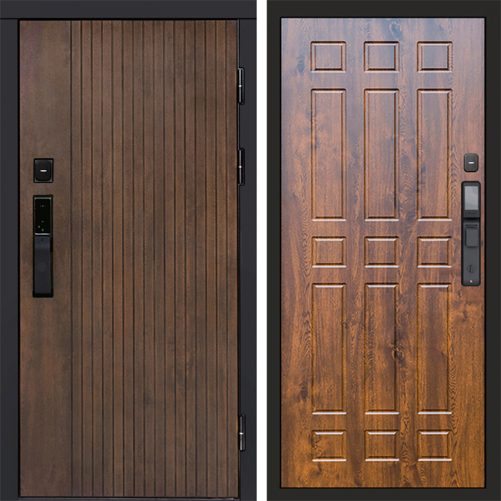 Входная дверь • Габаритные размеры: 2050x860 мм, 2050x960 мм • Металл 1.8мм. Черная шагрень • Внешнее покрытие: МДФ 12 мм. • Толщина полотна: 115 мм. • Толщина коробки: 120 мм. • Короб закрытого типа, утепленный • Уплотнитель: 3 контура • Два вертикальных ребра жесткости • ЭЛЕКТРОННЫЙ ЗАМОК НА ВЫБОР • Замок дополнительный: Гардиан 6001 • Врезная броненакладка • Пазы на коробке под доборы • Независимая задвижка есть • Фурнитура ЧЕРНАЯ