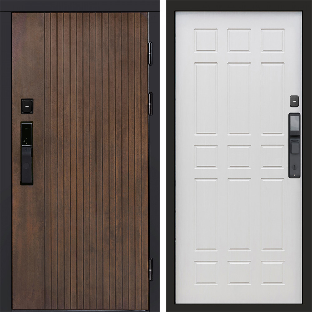 Входная дверь • Габаритные размеры: 2050x860 мм, 2050x960 мм • Металл 1.5мм. • Внешнее покрытие: МДФ 12 мм. • Цвет покрытия: Графит. • Толщина полотна: 100 мм. • Толщина коробки: 105 мм. • Окрас короба:Черная шагрень. • Короб закрытого типа, утепленный. • Уплотнитель: 3 контура. • Два вертикальных ребра жесткости. • Замок основной: Guardian 3211 (цилиндровый). • Замок дополнительный: Guardian 300 • Врезная броненакладка. • Независимая задвижка есть. • Фурнитура Черная.