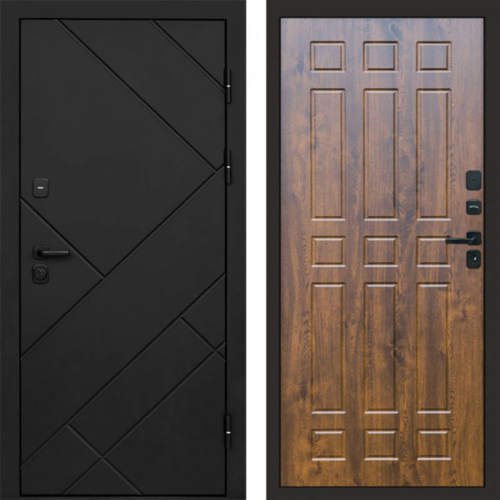 Входная дверь • Габаритные размеры: 2050x860 мм, 2050x960 мм • Металл 1.8мм. Черная шагрень • Внешнее покрытие: МДФ 12 мм. • Толщина полотна: 115 мм. • Толщина коробки: 120 мм. • Короб закрытого типа, утепленный • Уплотнитель: 3 контура • Два вертикальных ребра жесткости • ЭЛЕКТРОННЫЙ ЗАМОК НА ВЫБОР • Замок дополнительный: Гардиан 6001 • Врезная броненакладка • Пазы на коробке под доборы • Независимая задвижка есть • Фурнитура ЧЕРНАЯ