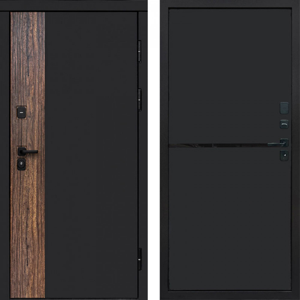 Входная дверь • Габаритные размеры: 2050x860 мм, 2050x960 мм • Металл 1.8мм. Черная шагрень • Внешнее покрытие: МДФ 12 мм. • Толщина полотна: 115 мм. • Толщина коробки: 120 мм. • Короб закрытого типа, утепленный • Уплотнитель: 3 контура • Два вертикальных ребра жесткости • ЭЛЕКТРОННЫЙ ЗАМОК НА ВЫБОР • Замок дополнительный: Гардиан 6001 • Врезная броненакладка • Пазы на коробке под доборы • Независимая задвижка есть • Фурнитура ЧЕРНАЯ