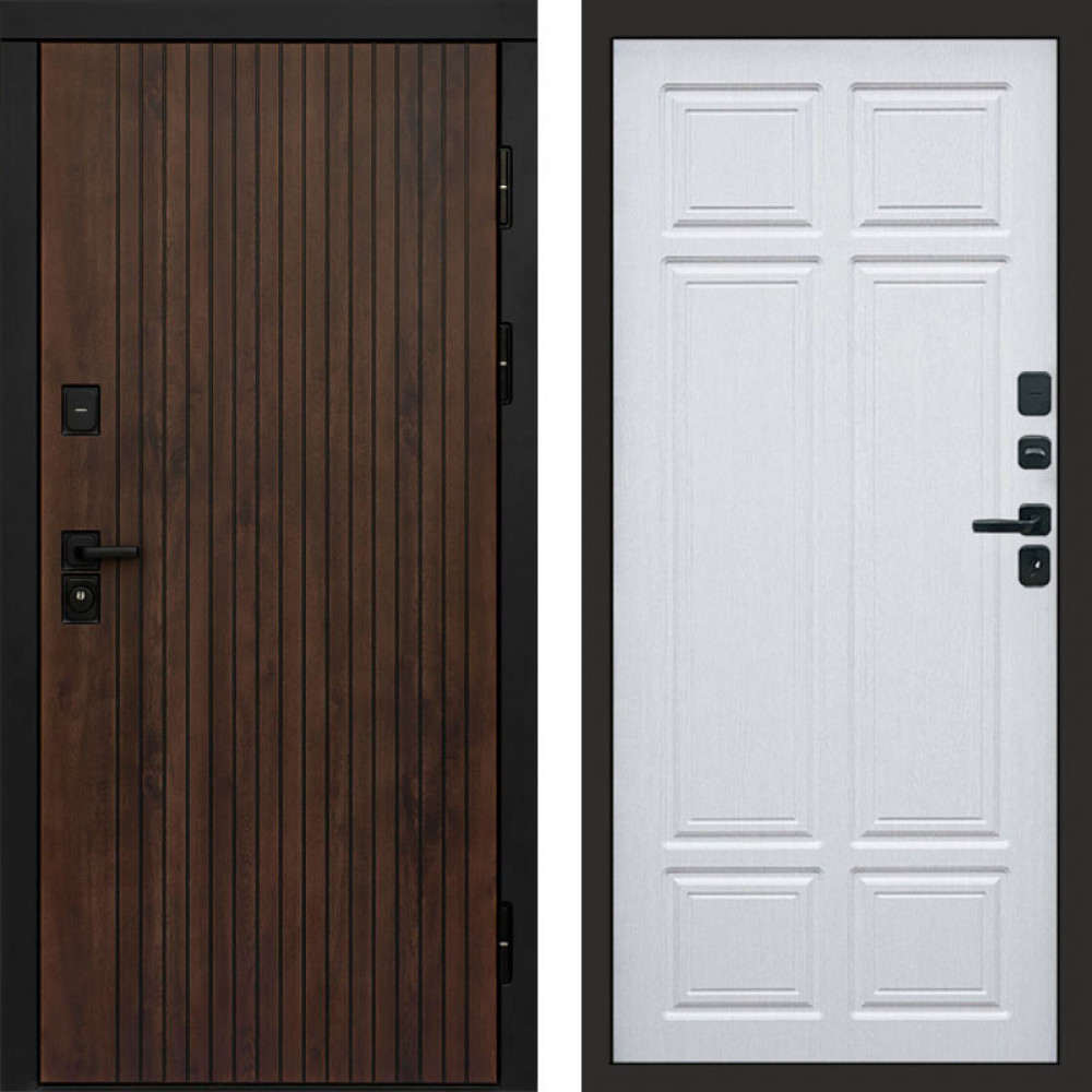 Входная дверь • Габаритные размеры: 2050x860 мм, 2050x960 мм • Металл 1.5мм. • Внешнее покрытие: МДФ 12 мм. • Цвет покрытия: Орех коньяк кантри/Черный кварц. • Толщина полотна: 100 мм. • Толщина коробки: 105 мм. • Окрас короба:Черная шагрень. • Короб закрытого типа, утепленный. • Уплотнитель: 3 контура. • Два вертикальных ребра жесткости. • Замок основной: Guardian 3211 (цилиндровый). • Замок дополнительный: Guardian 300 • Врезная броненакладка. • Независимая задвижка есть. • Фурнитура Черная.
