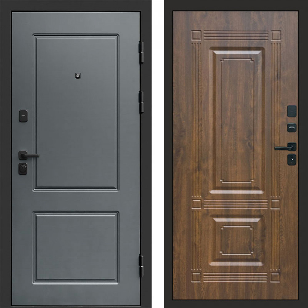 Входная дверь • Габаритные размеры: 2050x860 мм, 2050x960 мм • Металл 1.5мм. • Внешнее покрытие: МДФ 12 мм. • Цвет покрытия: Розвуд/Черный кварц. • Толщина полотна: 100 мм. • Толщина коробки: 105 мм. • Окрас короба:Черная шагрень. • Короб закрытого типа, утепленный. • Уплотнитель: 3 контура. • Два вертикальных ребра жесткости. • Замок основной: Guardian 3211 (цилиндровый). • Замок дополнительный: Guardian 300 • Врезная броненакладка. • Независимая задвижка есть. • Фурнитура Черная.