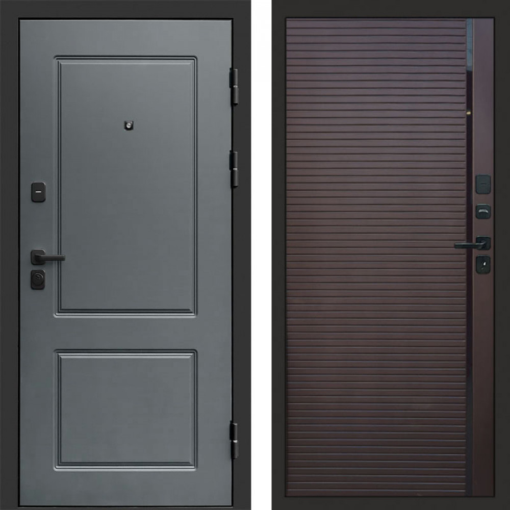 Входная дверь • Габаритные размеры: 2050x860 мм, 2050x960 мм • Металл 1.8мм • Внешнее покрытие: МДФ 16 мм. • Толщина полотна: 115 мм. • Толщина коробки: 120 мм. • Короб закрытого типа, утепленный • Уплотнитель: 3 контура • Два вертикальных ребра жесткости • Замок основной: Гардиан 6211 с блокировкой язычка • Замок дополнительный: Гардиан 6001 • Врезная броненакладка • Пазы на коробке под доборы • Независимая задвижка есть • Фурнитура Хром
