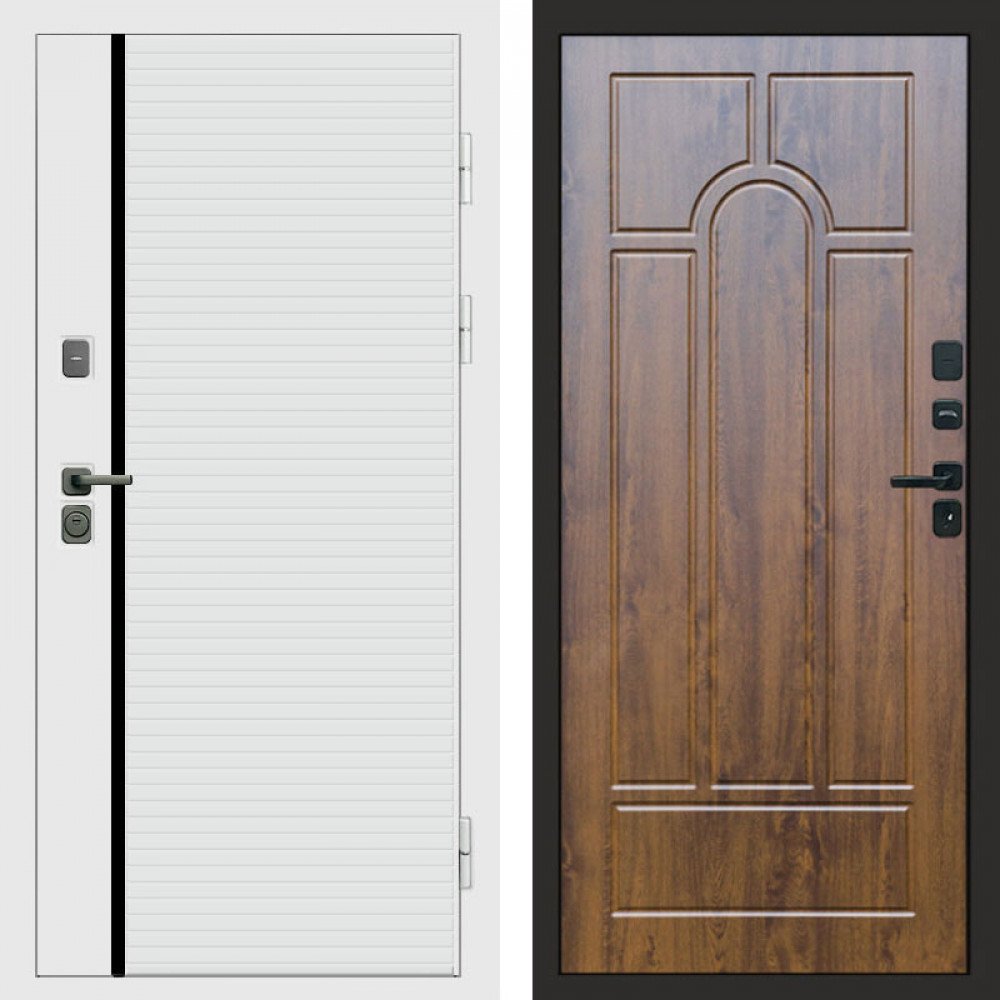 Входная дверь • Габаритные размеры: 2050x860 мм, 2050x960 мм • Металл 1.8мм • Внешнее покрытие: МДФ 16 мм. • Толщина полотна: 115 мм. • Толщина коробки: 120 мм. • Короб закрытого типа, утепленный • Уплотнитель: 3 контура • Два вертикальных ребра жесткости • Замок основной: Гардиан 6211 с блокировкой язычка • Замок дополнительный: Гардиан 6001 • Врезная броненакладка • Пазы на коробке под доборы • Независимая задвижка есть • Фурнитура Черная