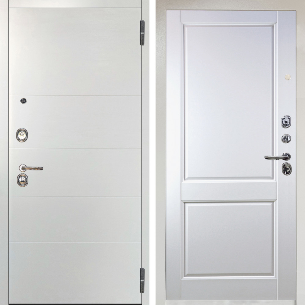 Входная дверь Афина Белый Мат с внутренней отделкой Лучи белый • Габаритные размеры: 2050x860 мм, 2050x960 мм • Металл 1.8мм • Внешнее покрытие: МДФ 16 мм. • Толщина полотна: 115 мм. • Толщина коробки: 120 мм. • Короб закрытого типа, утепленный • Уплотнитель: 3 контура • Два вертикальных ребра жесткости • Замок основной: Гардиан 6211 с блокировкой язычка • Замок дополнительный: Гардиан 6001 • Врезная броненакладка • Пазы на коробке под доборы • Независимая задвижка есть • Фурнитура ХРОМ