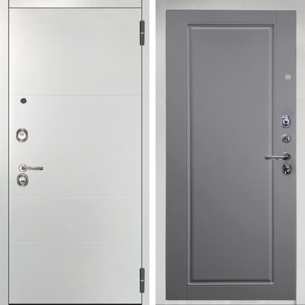 Входная дверь Афина Белый Мат с внутренней отделкой Вертикаль Силк маус • Габаритные размеры: 2050x860 мм, 2050x960 мм • Металл 1.8мм • Внешнее покрытие: МДФ 16 мм. • Толщина полотна: 115 мм. • Толщина коробки: 120 мм. • Короб закрытого типа, утепленный • Уплотнитель: 3 контура • Два вертикальных ребра жесткости • Замок основной: Гардиан 6211 с блокировкой язычка • Замок дополнительный: Гардиан 6001 • Врезная броненакладка • Пазы на коробке под доборы • Независимая задвижка есть • Фурнитура ХРОМ