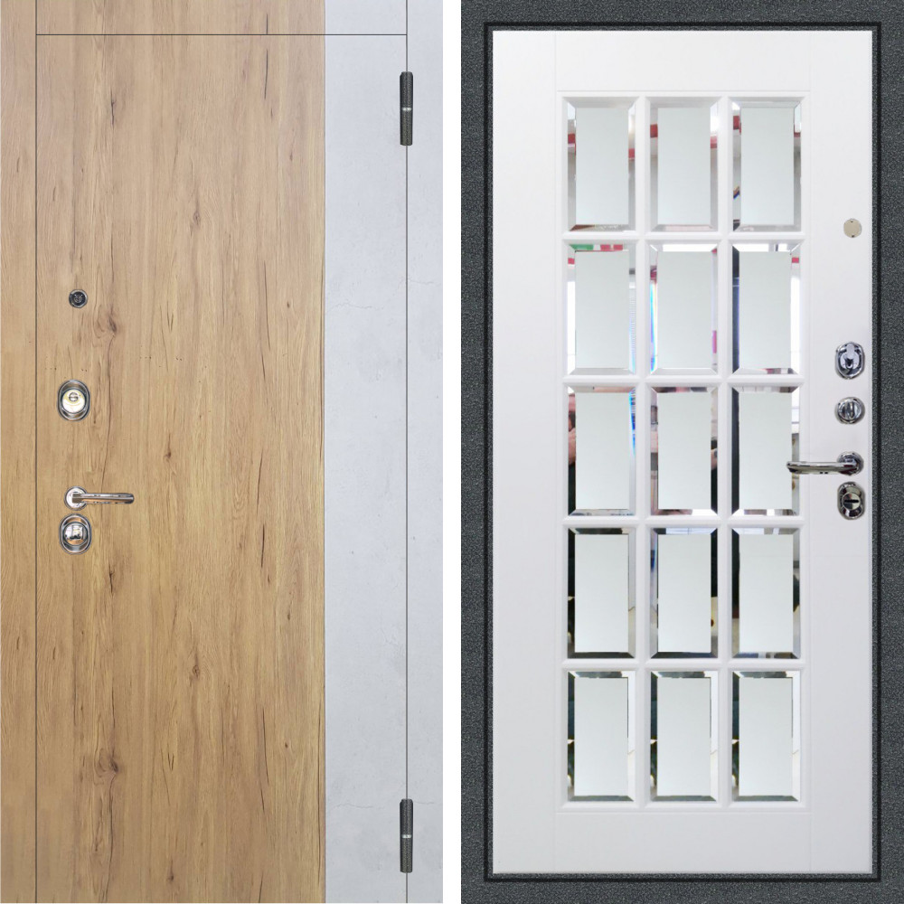 Входная дверь Аргус ЛЮКС 3К Эксперт Рустик соломенный вставка бетон урбан милк + Мэрелин Софт милк зеркало с фацетом и пескоструем