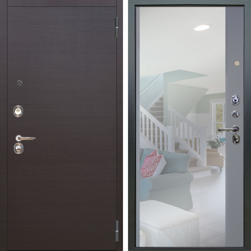 Входная дверь Авангард SMART с внутренней отделкой Зеркало венге • Габаритные размеры: 2050x860 мм, 2050x960 мм • Металл 1.8мм. Черная шагрень • Внешнее покрытие: МДФ 12 мм. • Толщина полотна: 115 мм. • Толщина коробки: 120 мм. • Короб закрытого типа, утепленный • Уплотнитель: 3 контура • Два вертикальных ребра жесткости • ЭЛЕКТРОННЫЙ ЗАМОК НА ВЫБОР • Замок дополнительный: Гардиан 6001 • Врезная броненакладка • Пазы на коробке под доборы • Независимая задвижка есть • Фурнитура ЧЕРНАЯ