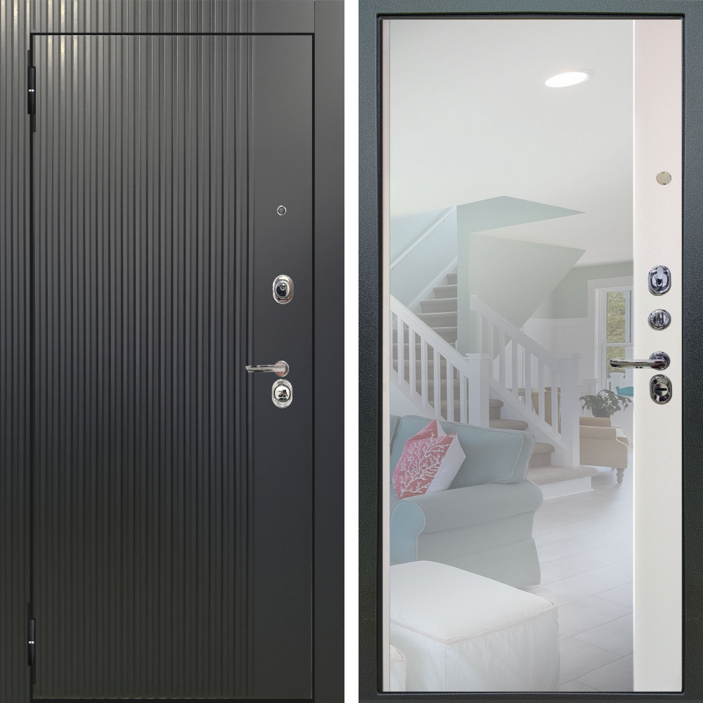 Входная дверь Агат Графит (Графит, черное стекло) с внутренней отделкой Лучи белый • Габаритные размеры: 2050x860 мм, 2050x960 мм • Металл 1.8мм • Внешнее покрытие: МДФ 16 мм. • Толщина полотна: 115 мм. • Толщина коробки: 120 мм. • Короб закрытого типа, утепленный • Уплотнитель: 3 контура • Два вертикальных ребра жесткости • Замок основной: Гардиан 6211 с блокировкой язычка • Замок дополнительный: Гардиан 6001 • Врезная броненакладка • Пазы на коробке под доборы • Независимая задвижка есть • Фурнитура Черная