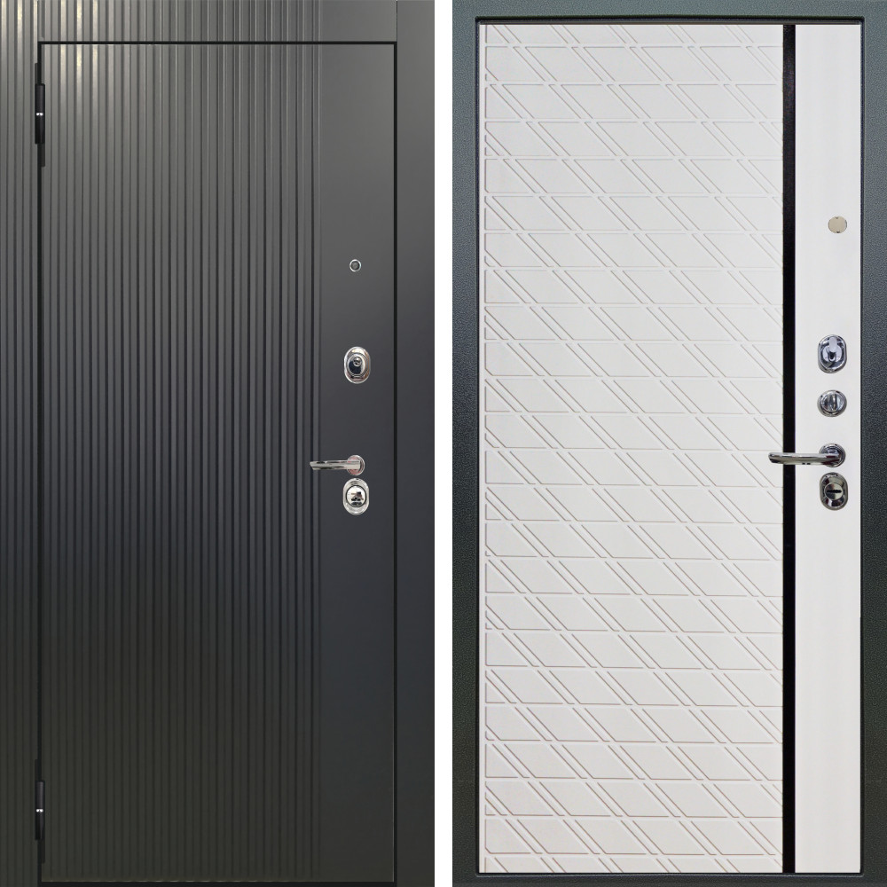Входная дверь Вертика с внутренней отделкой МС-100 белый матовый • Габаритные размеры: 2050x860 мм, 2050x960 мм • Металл 1.8мм • Внешнее покрытие: МДФ 16 мм белый мат с молдингом черная лакобель • Толщина полотна: 115 мм. • Толщина коробки: 120 мм. • Короб закрытого типа, утепленный • Уплотнитель: 3 контура • Два вертикальных ребра жесткости • Замок основной: Гардиан 6211 с блокировкой язычка • Замок дополнительный: Гардиан 6001 • Врезная броненакладка • Пазы на коробке под доборы • Независимая задвижка есть • Фурнитура Черная