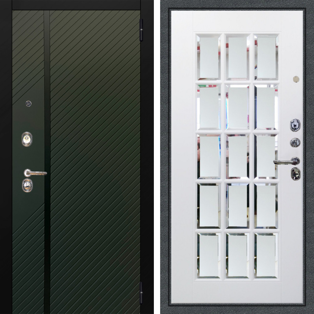 Входная дверь Аргус ЛЮКС 3К Ланцет Олива софт + Мэрелин Софт милк зеркало с фацетом и пескоструем