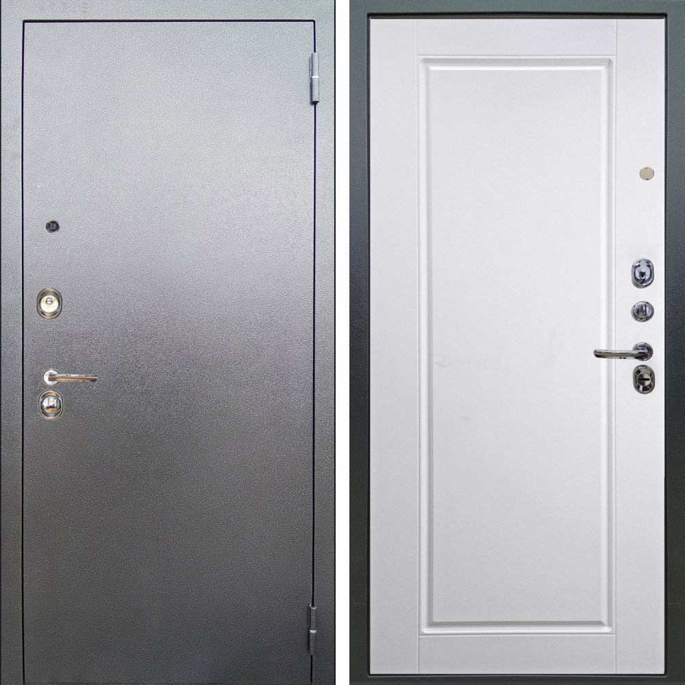 Входная дверь Шторм Графит с внутренней отделкой Лучи белый • Габаритные размеры: 2050x860 мм, 2050x960 мм • Металл 1.5мм. • Внешнее покрытие: МДФ 12 мм. • Цвет покрытия: Графит. • Толщина полотна: 100 мм. • Толщина коробки: 105 мм. • Окрас короба:Черная шагрень. • Короб закрытого типа, утепленный. • Уплотнитель: 3 контура. • Два вертикальных ребра жесткости. • Замок основной: Guardian 3211 (цилиндровый). • Замок дополнительный: Guardian 300 • Врезная броненакладка. • Независимая задвижка есть. • Фурнитура Черная.