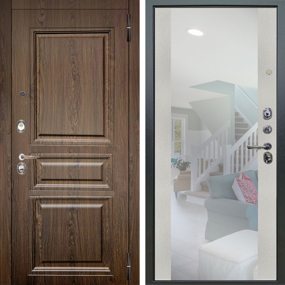 Входная дверь Termo-Door с утеплением: внешняя отделка Техно Серебро Антик, внутренняя отделка Зеркало Триумф Белый софт.Толщина полотна 90 мм., цилиндровый замок, доставка и установка в Москве и МО, гарантия 1 год.
