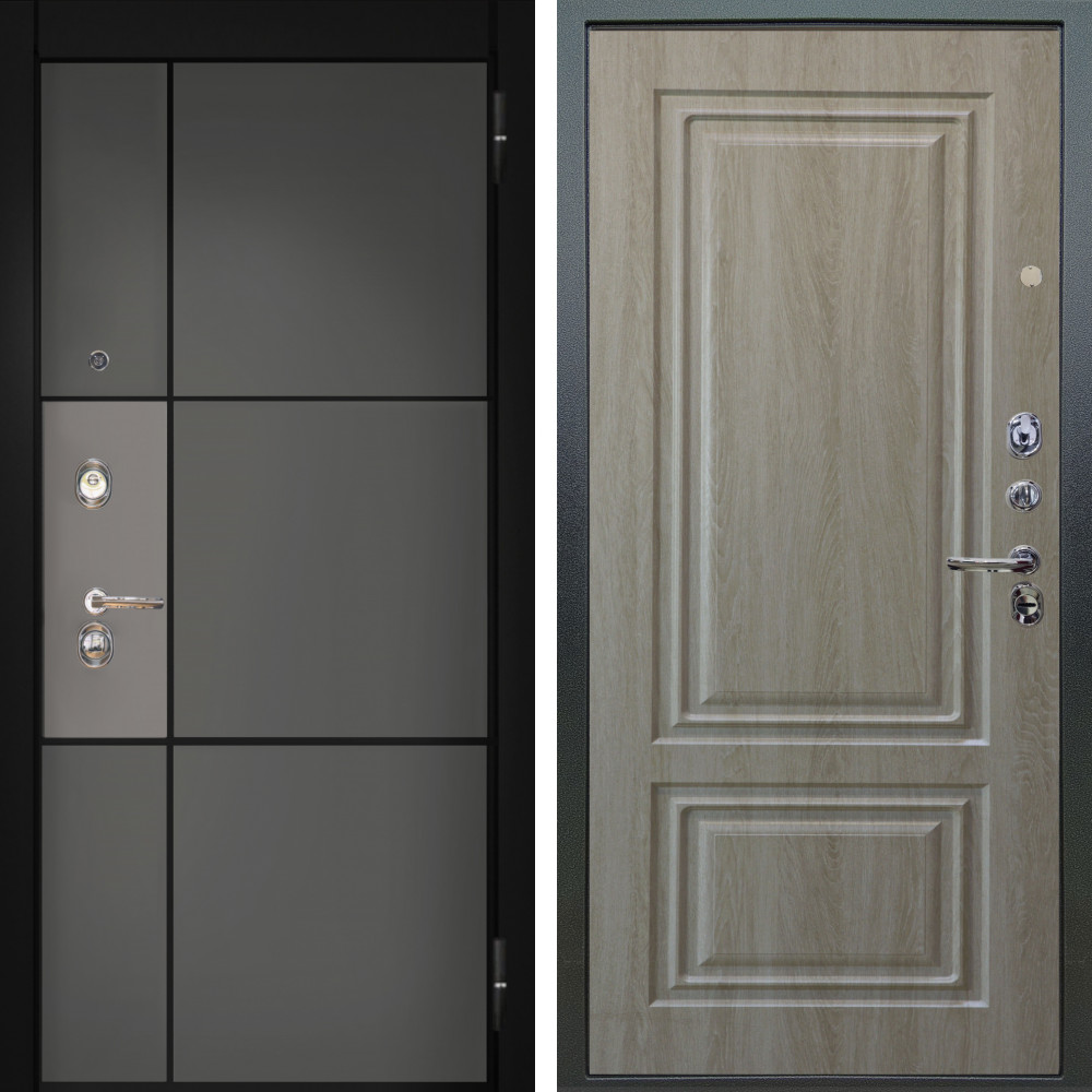 Входная дверь Termo-Door с утеплением: внешняя отделка Геометрия Дуб, внутренняя отделка Зеркало Фацет Черный кварц+тонировка серая.Толщина полотна 100 мм., цилиндровый замок, доставка и установка в Москве и МО, гарантия 1 год.