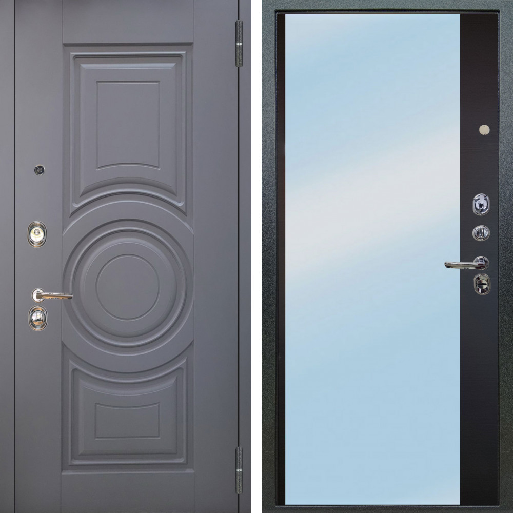 Входная дверь Агат (Черный кварц,черное стекло) с внутренней отделкой Зеркало бетон светлый • Габаритные размеры: 2050x860 мм, 2050x960 мм • Металл 1.8мм • Внешнее покрытие: МДФ 16 мм. • Толщина полотна: 115 мм. • Толщина коробки: 120 мм. • Короб закрытого типа, утепленный • Уплотнитель: 3 контура • Два вертикальных ребра жесткости • Замок основной: Гардиан 6211 с блокировкой язычка • Замок дополнительный: Гардиан 6001 • Врезная броненакладка • Пазы на коробке под доборы • Независимая задвижка есть • Фурнитура Черная