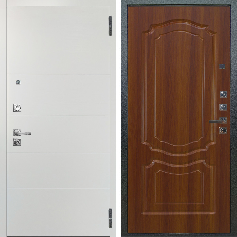 Полотно - два листа металла, Замковая зона усилена металлическим бронепакетом. Ответная часть замковой зоны усилена стальным швеллером,что сводит к минимуму попытки вскрытия двери методом отжима. Бронепластины на коробе в зоне входа ригелей замка. 2 специальных армированных прута внутри конструкции надёжно защитят дверь от вскрытия килечным ножом.