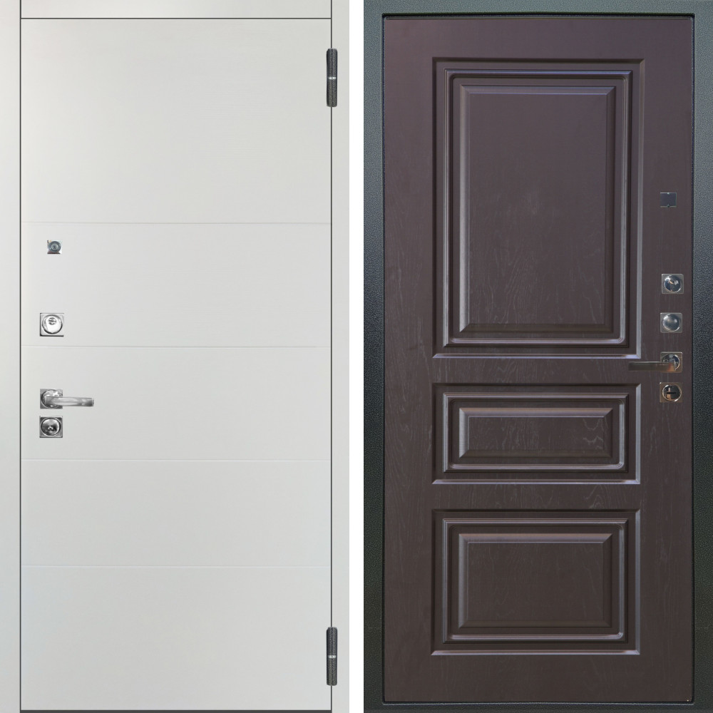 Полотно - два листа металла, Замковая зона усилена металлическим бронепакетом. Ответная часть замковой зоны усилена стальным швеллером,что сводит к минимуму попытки вскрытия двери методом отжима. Бронепластины на коробе в зоне входа ригелей замка. 2 специальных армированных прута внутри конструкции надёжно защитят дверь от вскрытия килечным ножом.
