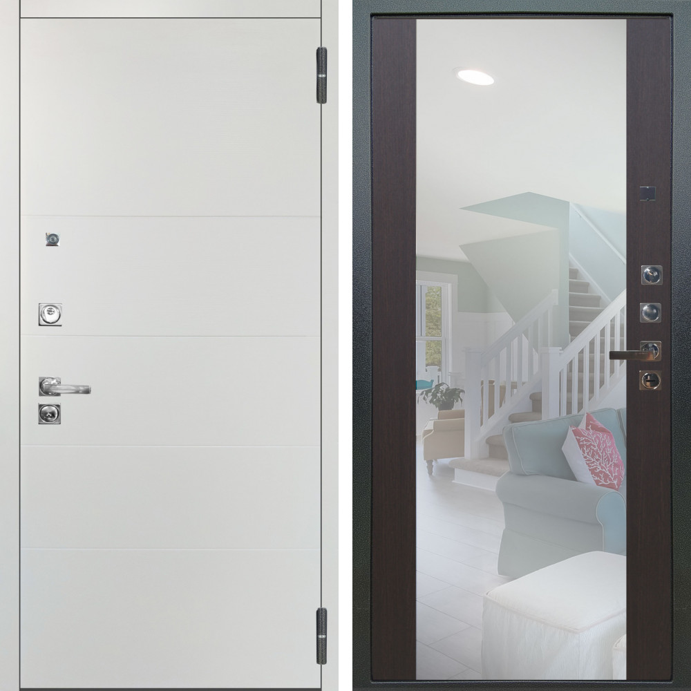 Входная дверь Афина Белый Мат с внутренней отделкой Зеркало панорама Черный кварц • Габаритные размеры: 2050x860 мм, 2050x960 мм • Металл 1.8мм • Внешнее покрытие: МДФ 16 мм. • Толщина полотна: 115 мм. • Толщина коробки: 120 мм. • Короб закрытого типа, утепленный • Уплотнитель: 3 контура • Два вертикальных ребра жесткости • Замок основной: Гардиан 6211 с блокировкой язычка • Замок дополнительный: Гардиан 6001 • Врезная броненакладка • Пазы на коробке под доборы • Независимая задвижка есть • Фурнитура ХРОМ