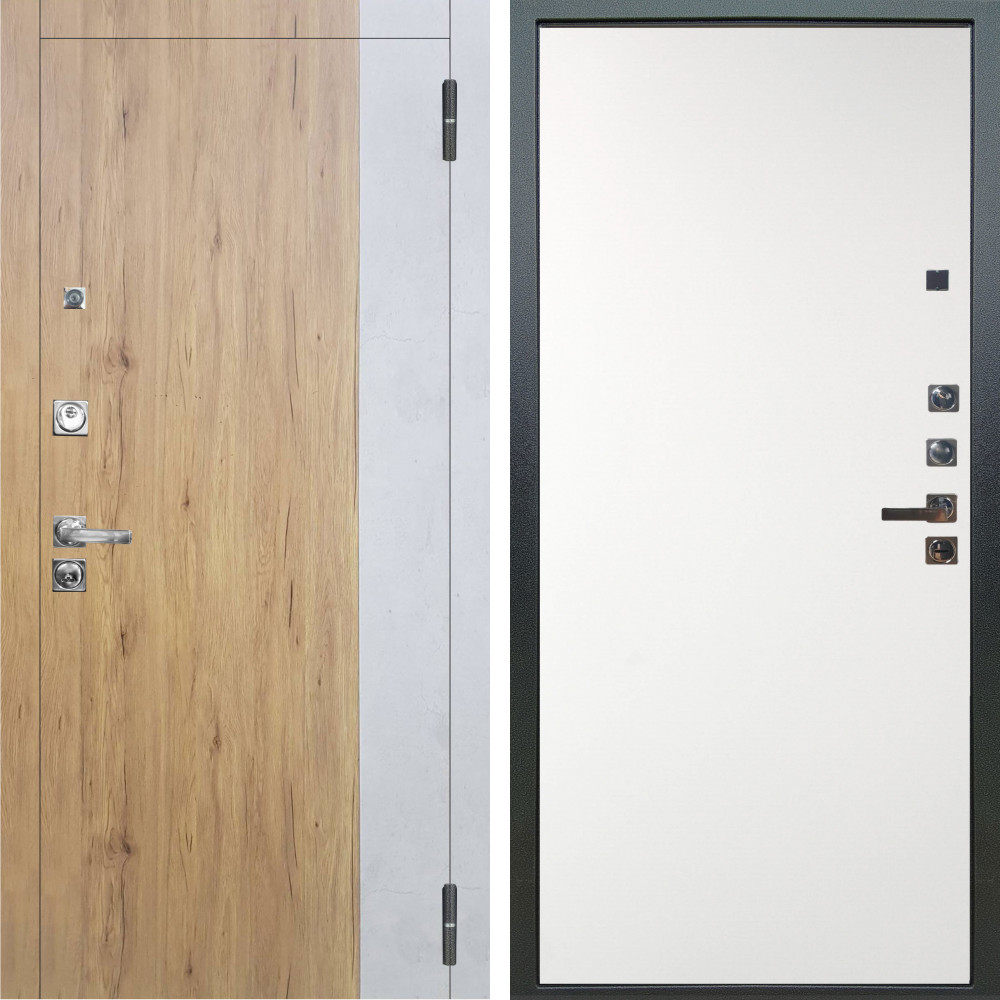 Полотно - два листа металла, Замковая зона усилена металлическим бронепакетом. Ответная часть замковой зоны усилена стальным швеллером,что сводит к минимуму попытки вскрытия двери методом отжима. Бронепластины на коробе в зоне входа ригелей замка. 2 специальных армированных прута внутри конструкции надёжно защитят дверь от вскрытия килечным ножом.