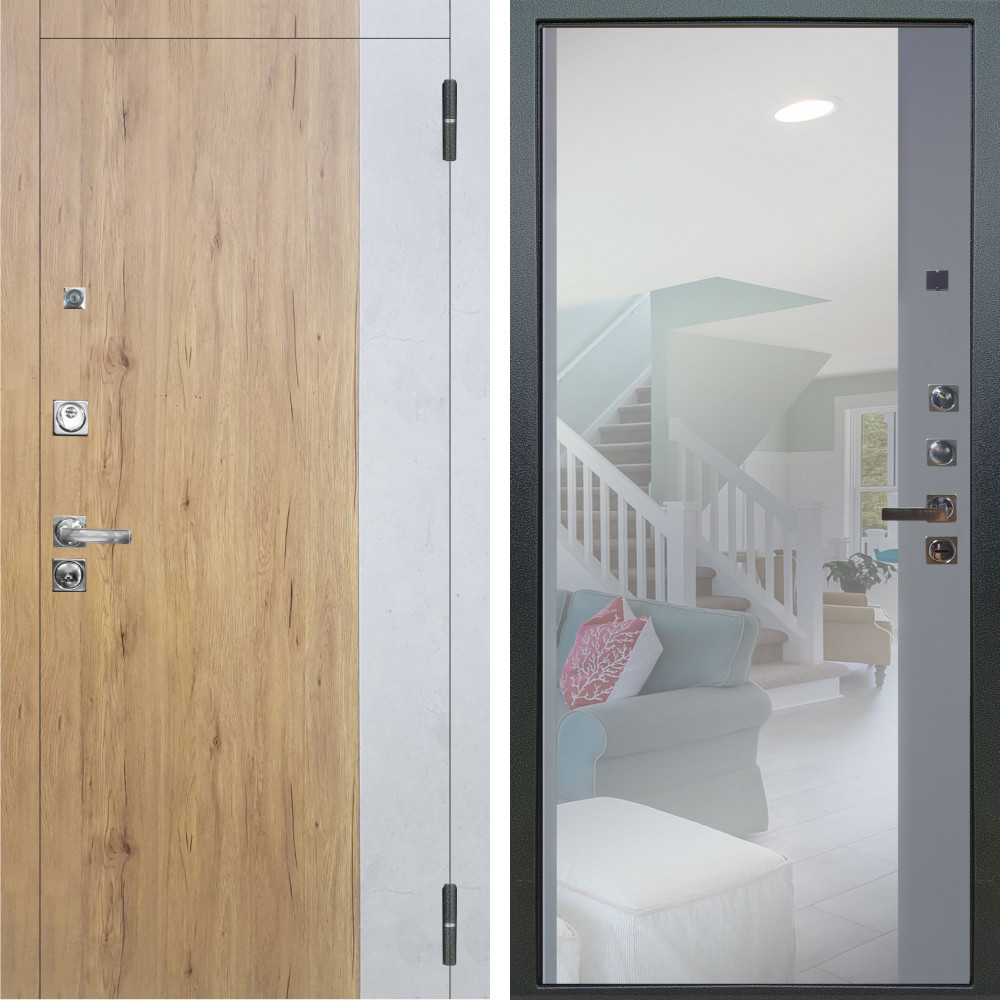 Входная дверь Премиум Бетон Темный с внутренней отделкой Зеркало бетон светлый • Габаритные размеры: 2050x860 мм, 2050x960 мм • Металл 1.8мм • Внешнее покрытие: МДФ 16 мм. • Толщина полотна: 115 мм. • Толщина коробки: 120 мм. • Короб закрытого типа, утепленный • Уплотнитель: 3 контура • Два вертикальных ребра жесткости • Замок основной: Гардиан 6211 с блокировкой язычка • Замок дополнительный: Гардиан 6001 • Врезная броненакладка • Пазы на коробке под доборы • Независимая задвижка есть • Фурнитура Хром