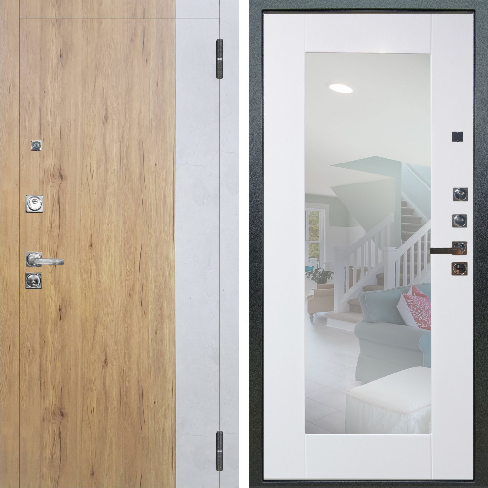 Входная дверь Шторм Графит SMART с внутренней отделкой Зеркало беленый дуб • Габаритные размеры: 2050x860 мм, 2050x960 мм • Металл 1.8мм. Черная шагрень • Внешнее покрытие: МДФ 12 мм. • Толщина полотна: 115 мм. • Толщина коробки: 120 мм. • Короб закрытого типа, утепленный • Уплотнитель: 3 контура • Два вертикальных ребра жесткости • ЭЛЕКТРОННЫЙ ЗАМОК НА ВЫБОР • Замок дополнительный: Гардиан 6001 • Врезная броненакладка • Пазы на коробке под доборы • Независимая задвижка есть • Фурнитура ЧЕРНАЯ