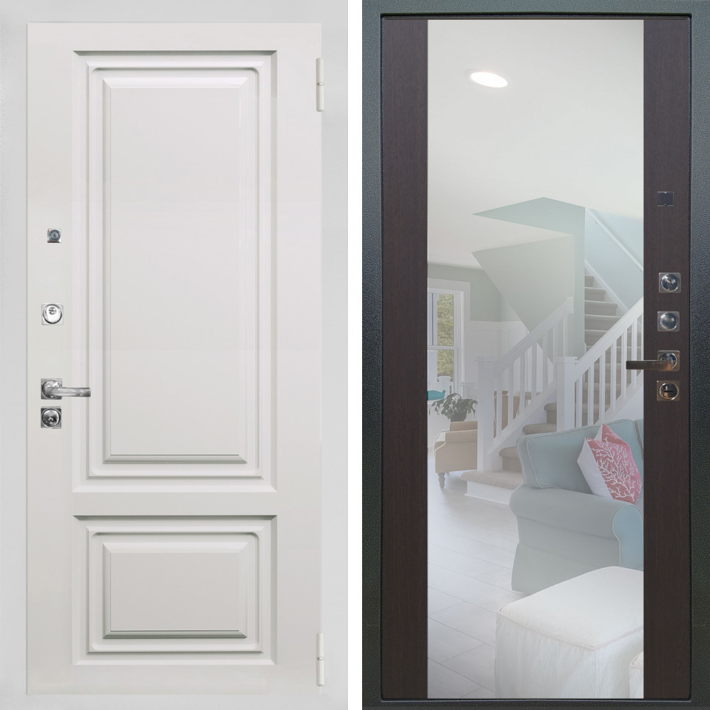 Входная дверь Агат Графит (Графит, черное стекло) с внутренней отделкой Зеркало белый софт • Габаритные размеры: 2050x860 мм, 2050x960 мм • Металл 1.8мм • Внешнее покрытие: МДФ 16 мм. • Толщина полотна: 115 мм. • Толщина коробки: 120 мм. • Короб закрытого типа, утепленный • Уплотнитель: 3 контура • Два вертикальных ребра жесткости • Замок основной: Гардиан 6211 с блокировкой язычка • Замок дополнительный: Гардиан 6001 • Врезная броненакладка • Пазы на коробке под доборы • Независимая задвижка есть • Фурнитура Черная