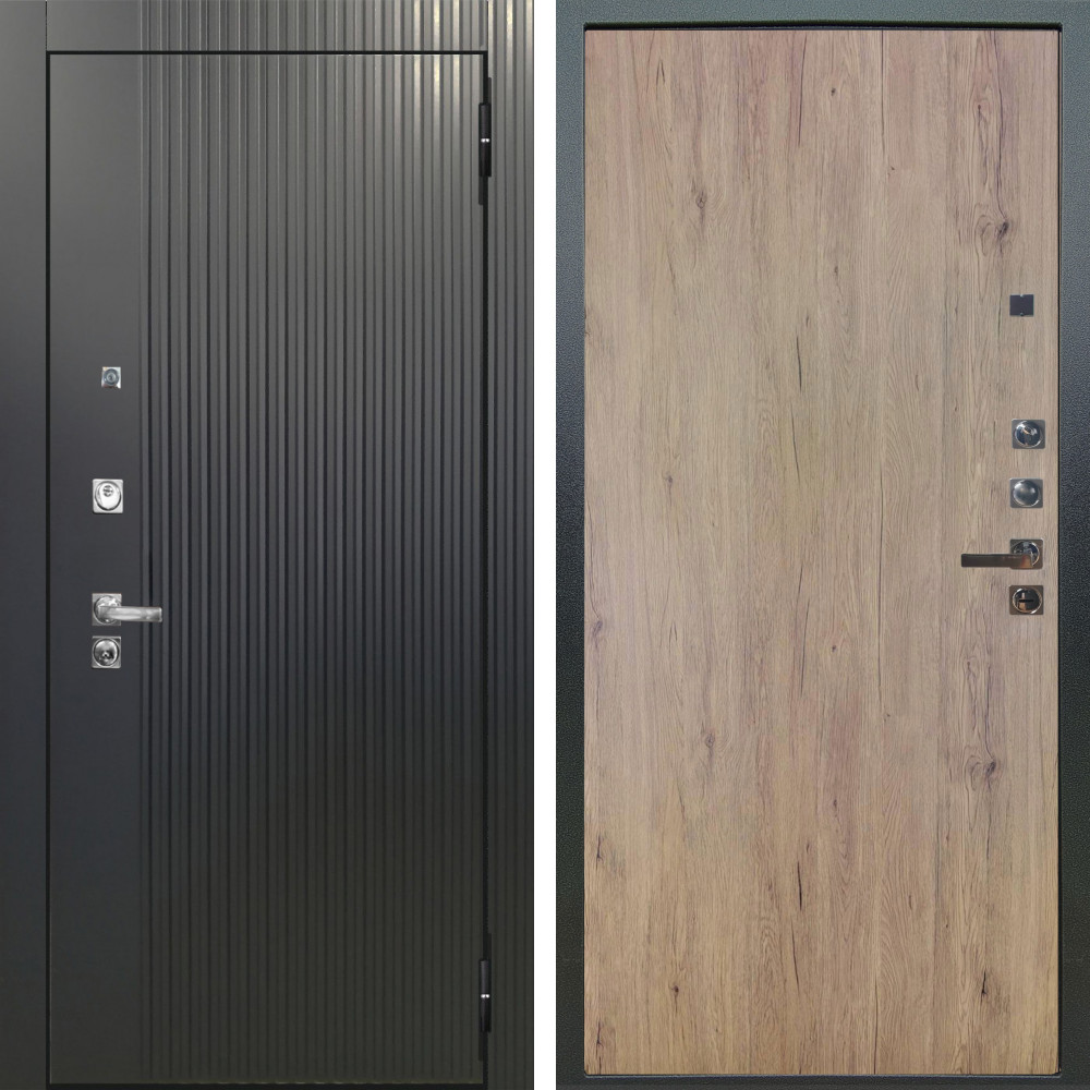 Входная дверь Шторм SMART с внутренней отделкой ФЛ-39 эко дуб • Габаритные размеры: 2050x860 мм, 2050x960 мм • Металл 1.8мм. Черная шагрень • Внешнее покрытие: МДФ 12 мм. • Толщина полотна: 115 мм. • Толщина коробки: 120 мм. • Короб закрытого типа, утепленный • Уплотнитель: 3 контура • Два вертикальных ребра жесткости • ЭЛЕКТРОННЫЙ ЗАМОК НА ВЫБОР • Замок дополнительный: Гардиан 6001 • Врезная броненакладка • Пазы на коробке под доборы • Независимая задвижка есть • Фурнитура ЧЕРНАЯ